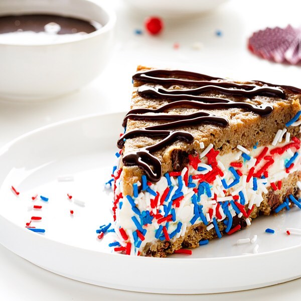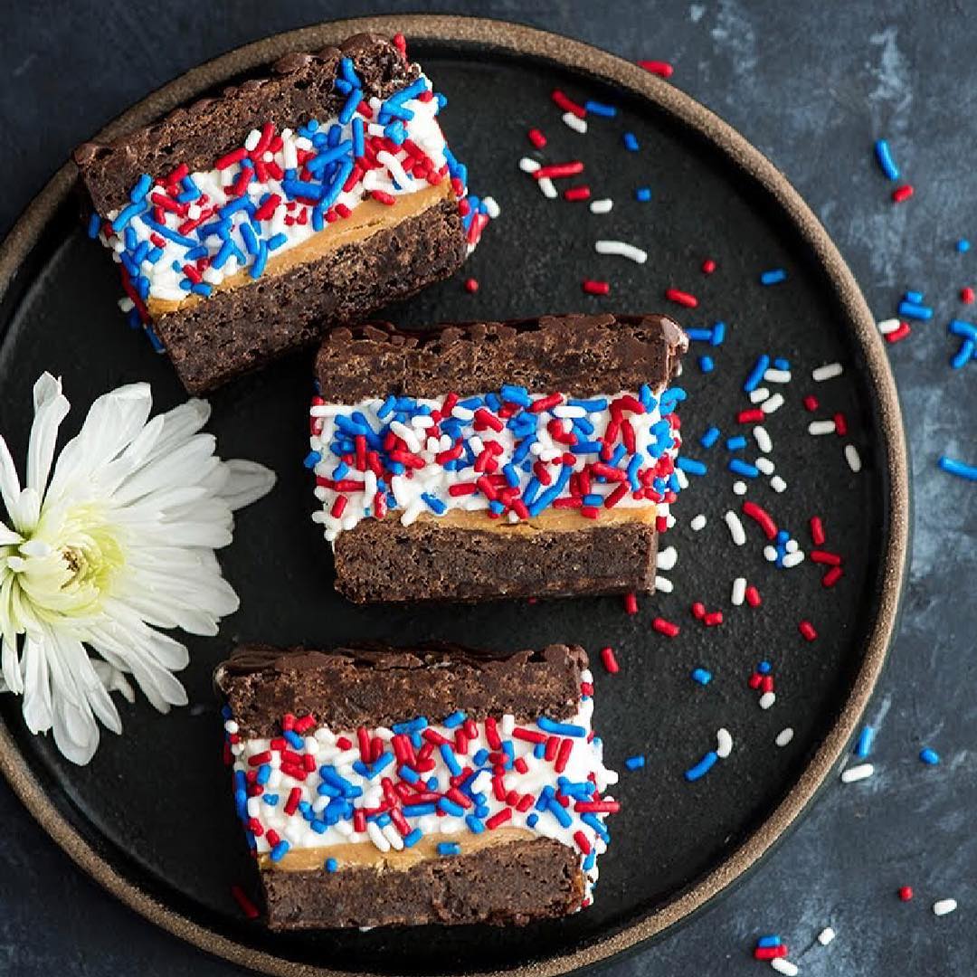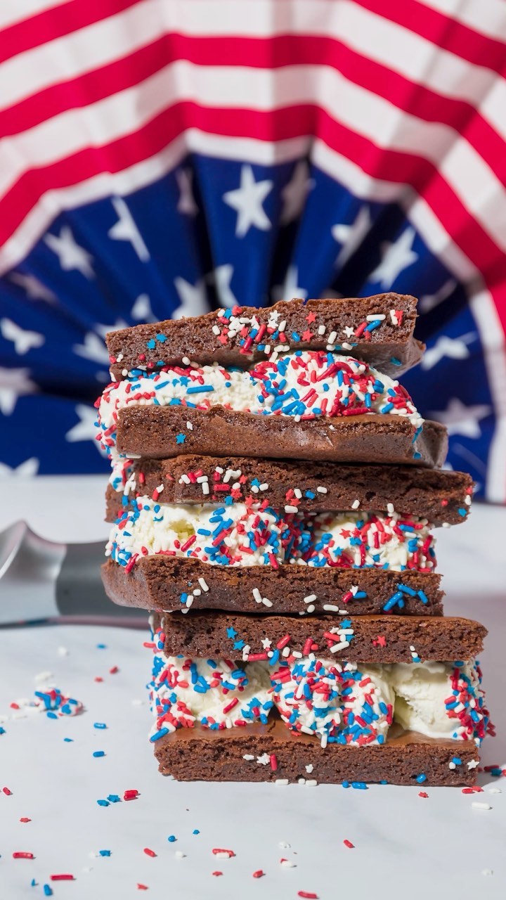 Rich brownie slabs swap in for cookies and instantly deepen the flavor. Thick scoops of vanilla ice cream create bold, stacked layers that feel over-the-top in the best way. Red, white, and blue sprinkles keep the look festive without competing with the chocolate. Tip: cut clean squares to show off those striking layers.