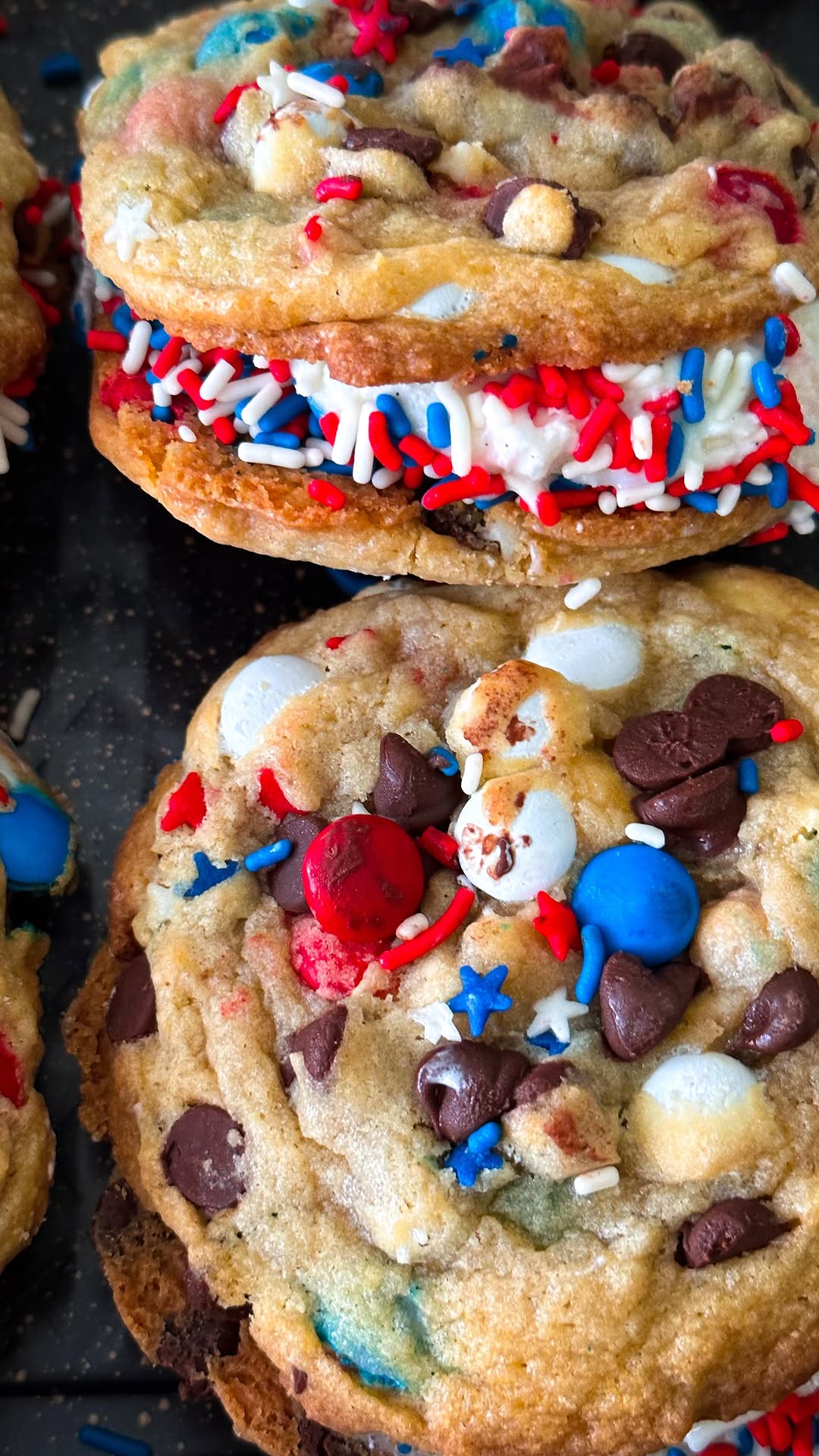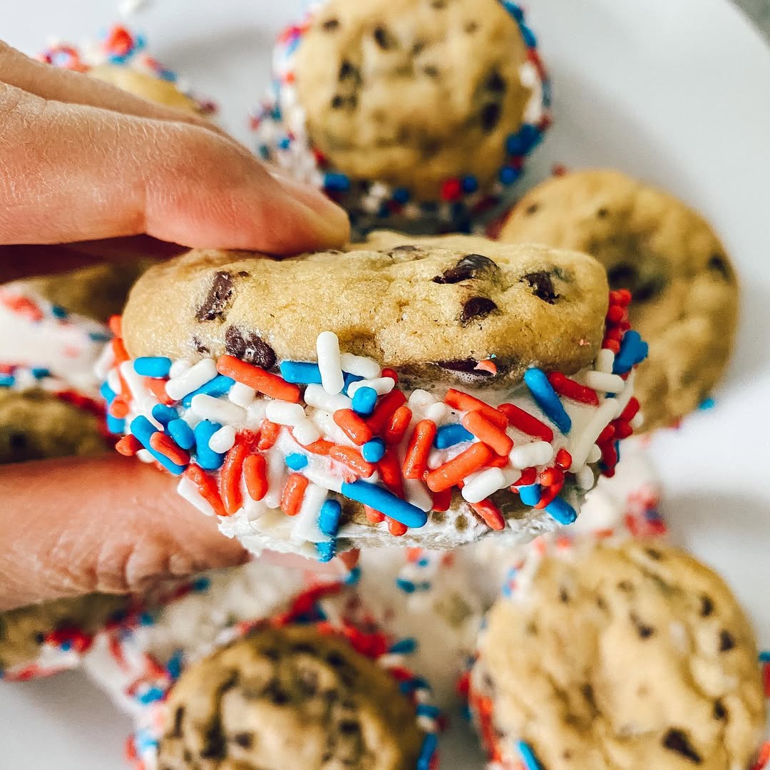 Mini chocolate chip cookies keep things soft, thick, and totally satisfying. The heavy रोल of red, white, and blue sprinkles adds instant festive texture. Holding it in hand makes the size and indulgence feel real. Tip: pack the edges generously so every bite looks loaded and worth it.