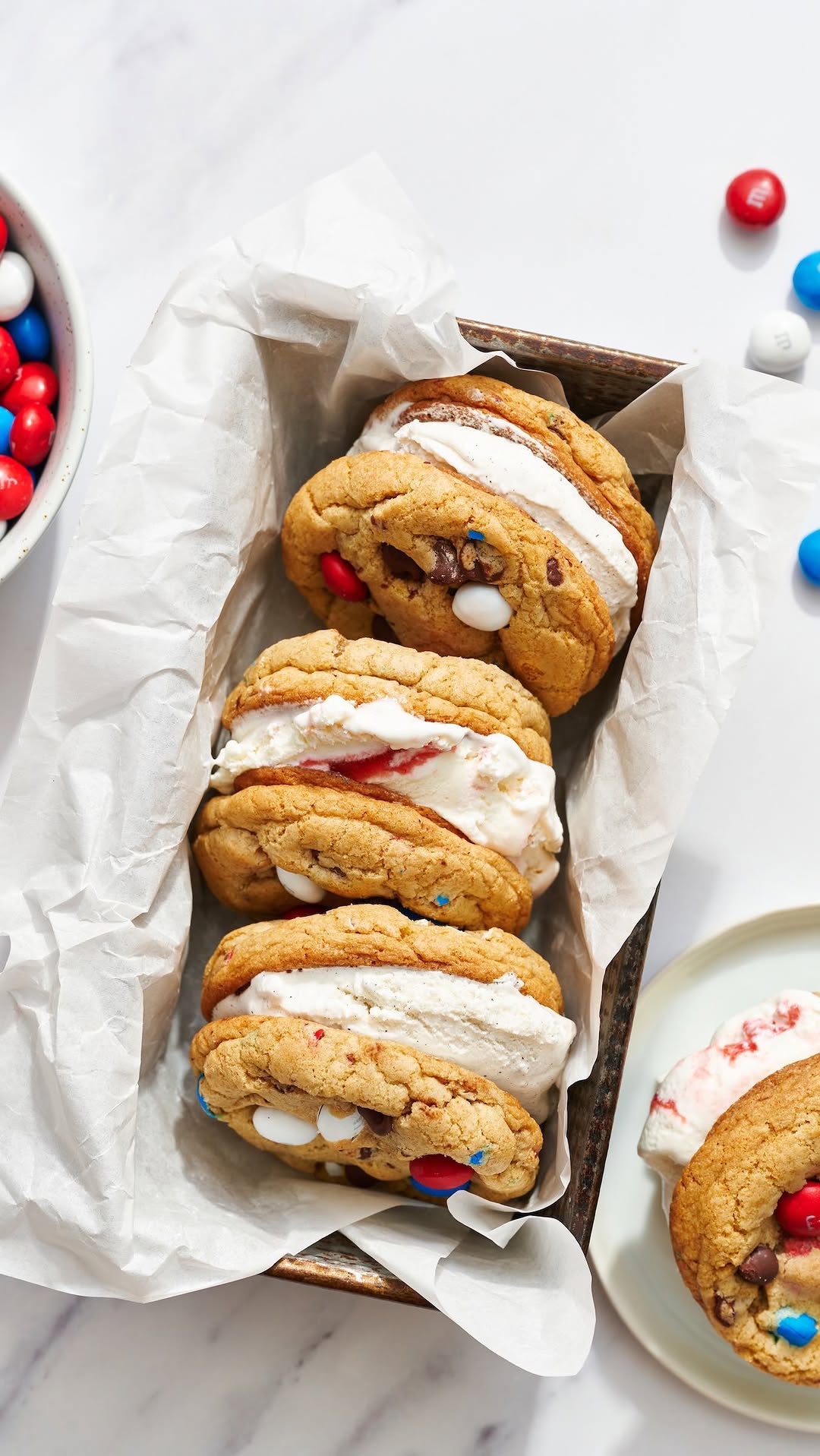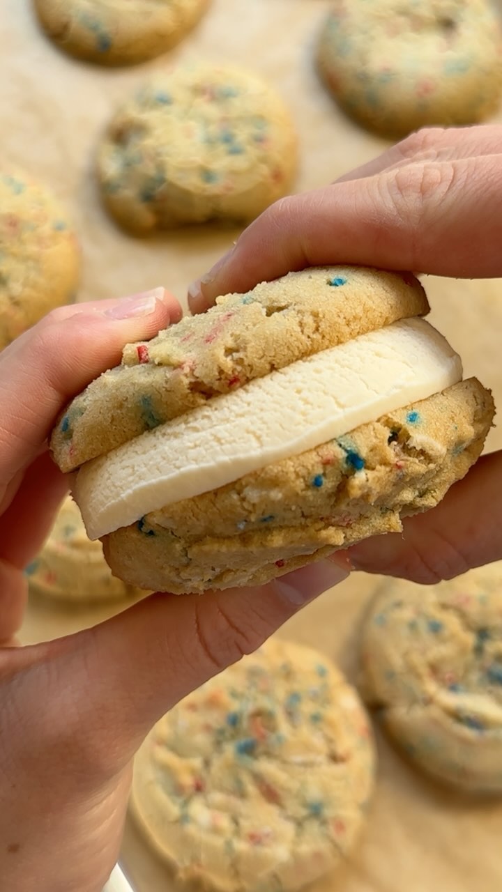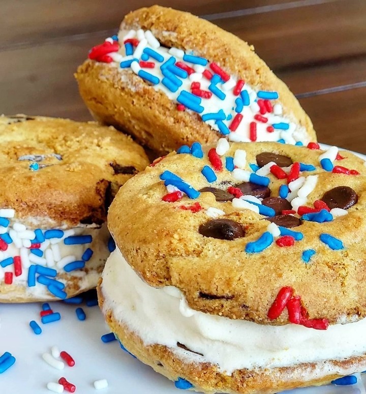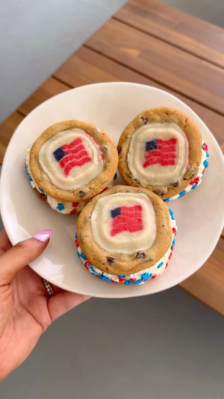 Thick, pillowy cookies create a soft bite that feels fresh from the oven. The smooth slab of vanilla ice cream keeps the look clean and classic. Subtle red and blue flecks inside the dough add a quiet nod to the theme. Tip: keep the cookies slightly underbaked for that perfect soft-meets-creamy texture.