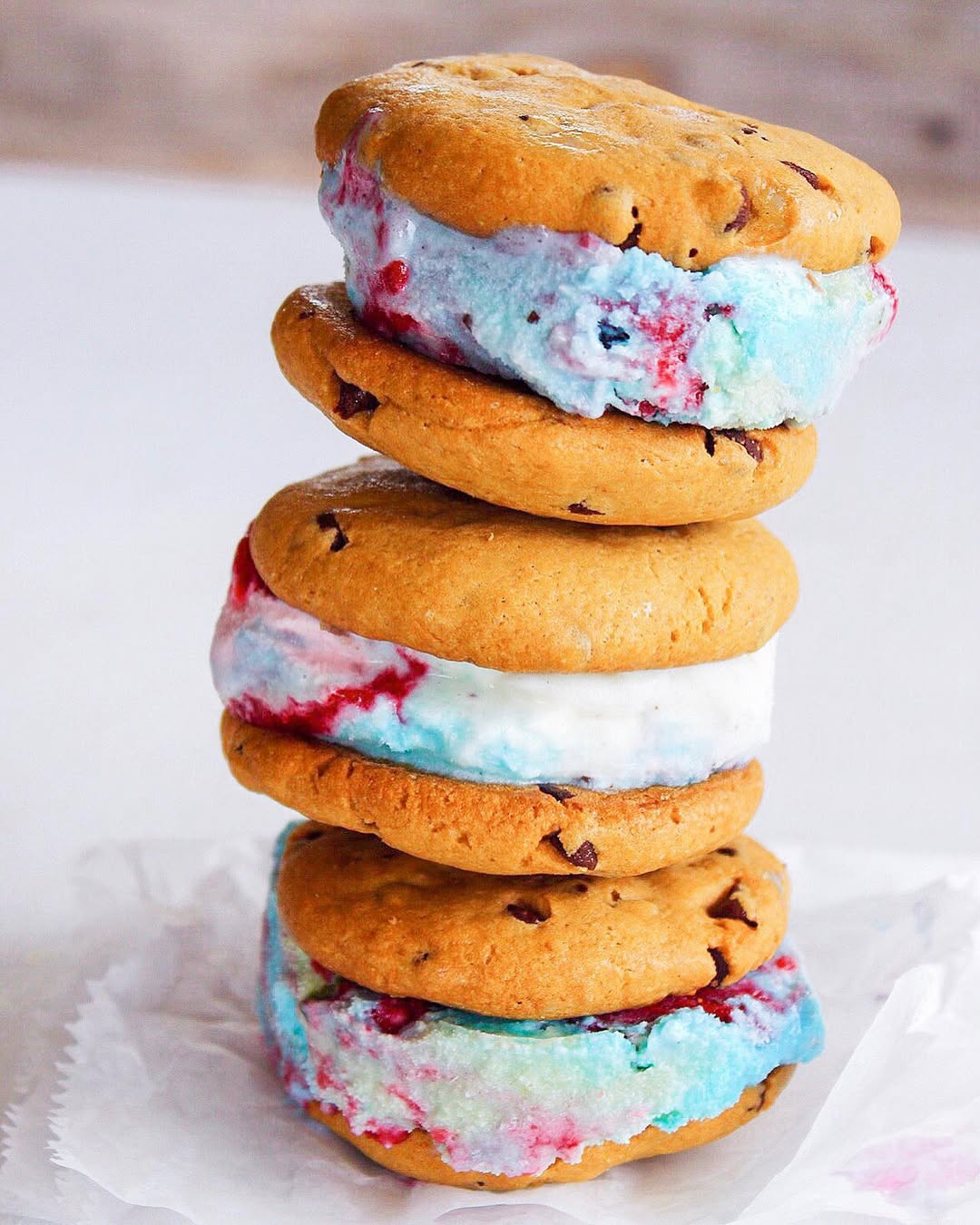 Bright red and blue streaks ripple through the ice cream for a playful twist. Golden chocolate chip cookies keep the base classic and comforting. The stacked presentation adds height and instant visual appeal. Tip: colorful swirls like this make each sandwich feel unique and eye-catching.