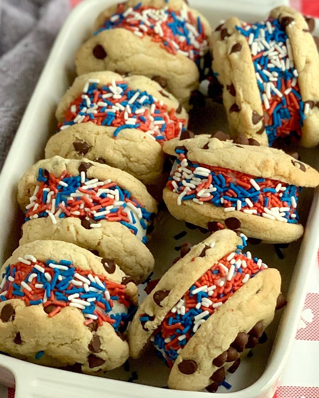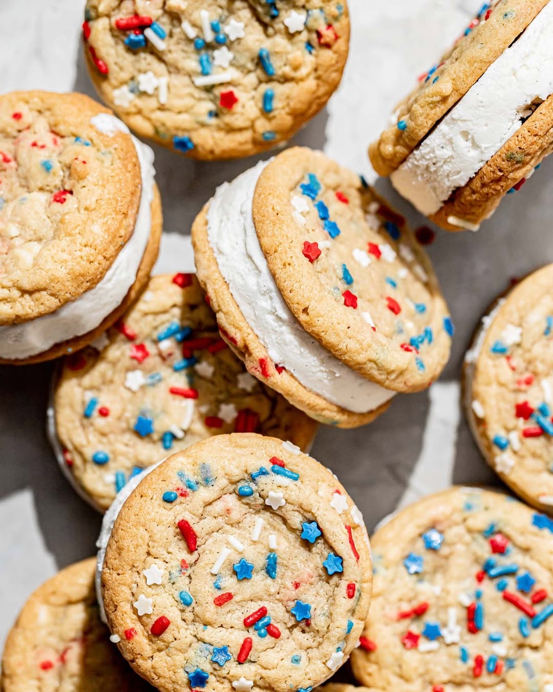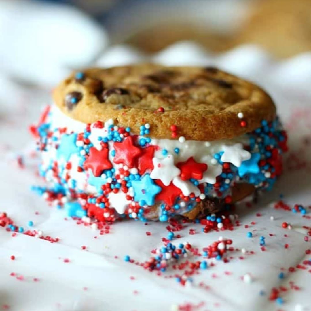 Soft-baked cookies bring a homemade feel that instantly ups the charm. The red, white, and blue sprinkles baked right in keep things festive without extra effort. Thick slabs of vanilla ice cream make each sandwich look generous and worth the splurge. Tip: keep the cookies slightly underbaked so they stay chewy even when frozen.