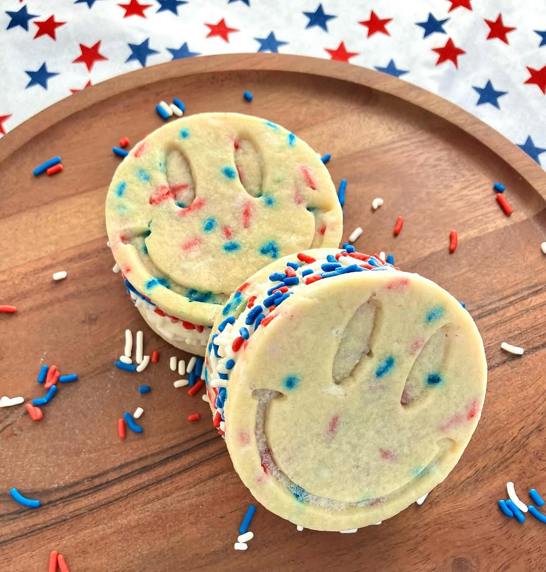 Playful embossing turns these sandwiches into instant mood-lifters. The soft sugar cookies feel nostalgic and a little whimsical in the best way. Red, white, and blue sprinkles tucked into the dough keep the theme subtle but clear. Tip: simple shapes like this make your batch feel custom without extra effort.