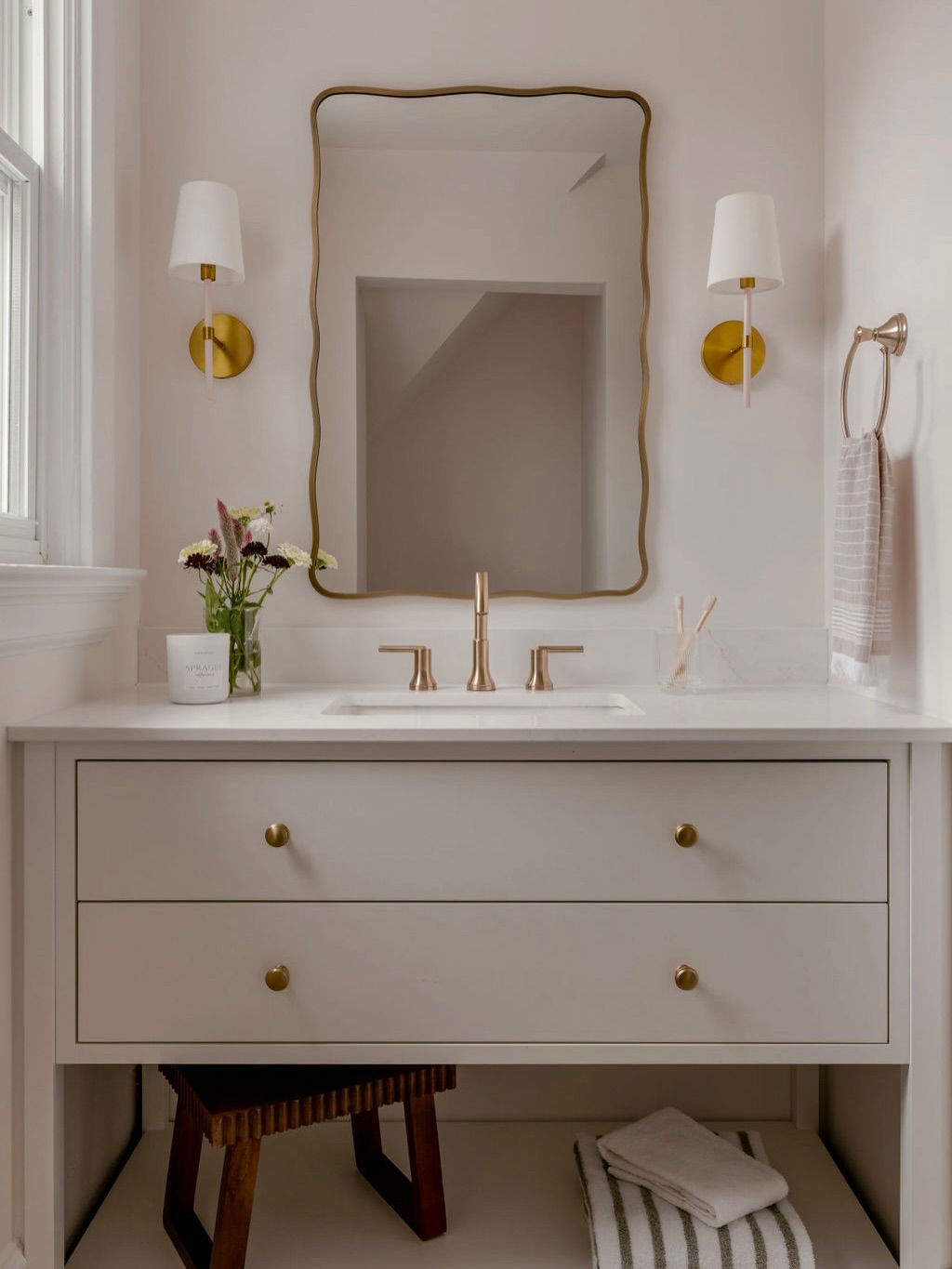A scalloped-edge mirror brings a playful twist to an otherwise refined setup. Brass fixtures and crisp sconces keep the palette warm but elevated. Clean-lined drawers handle the storage quietly, while the open cubby below leaves room for styling—or a stool that feels too cute to hide. Understated, but far from boring.