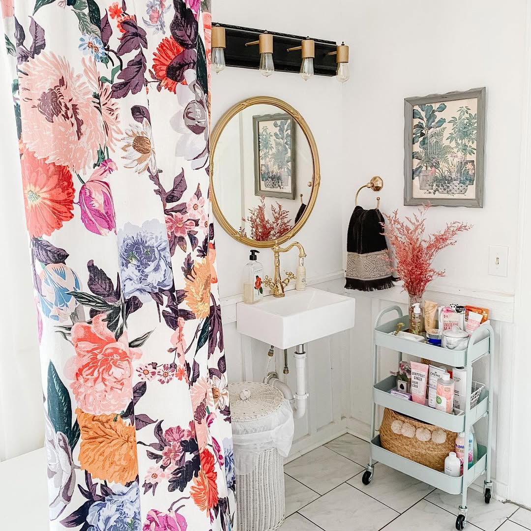A powder room that doesn’t take itself too seriously—thanks to a bold floral curtain and a pastel utility cart turned beauty station. The vintage gold mirror and faucet add charm without going full antique-store. Art prints and dried stems layer in extra color and texture. Storage may be small, but the vibe is big.