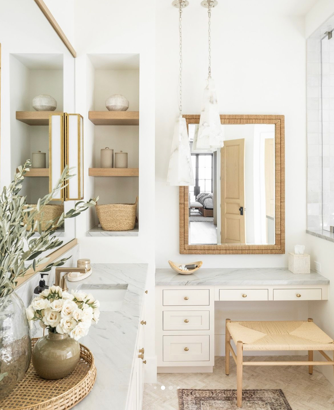 Open shelves, a woven bench, and delicate brass details create a bathroom that feels both styled and serene. Shallow drawers keep clutter tucked away, while baskets and trays elevate the storage game without adding visual weight. Layered lighting and soft marble pull it all together in an airy, livable way.