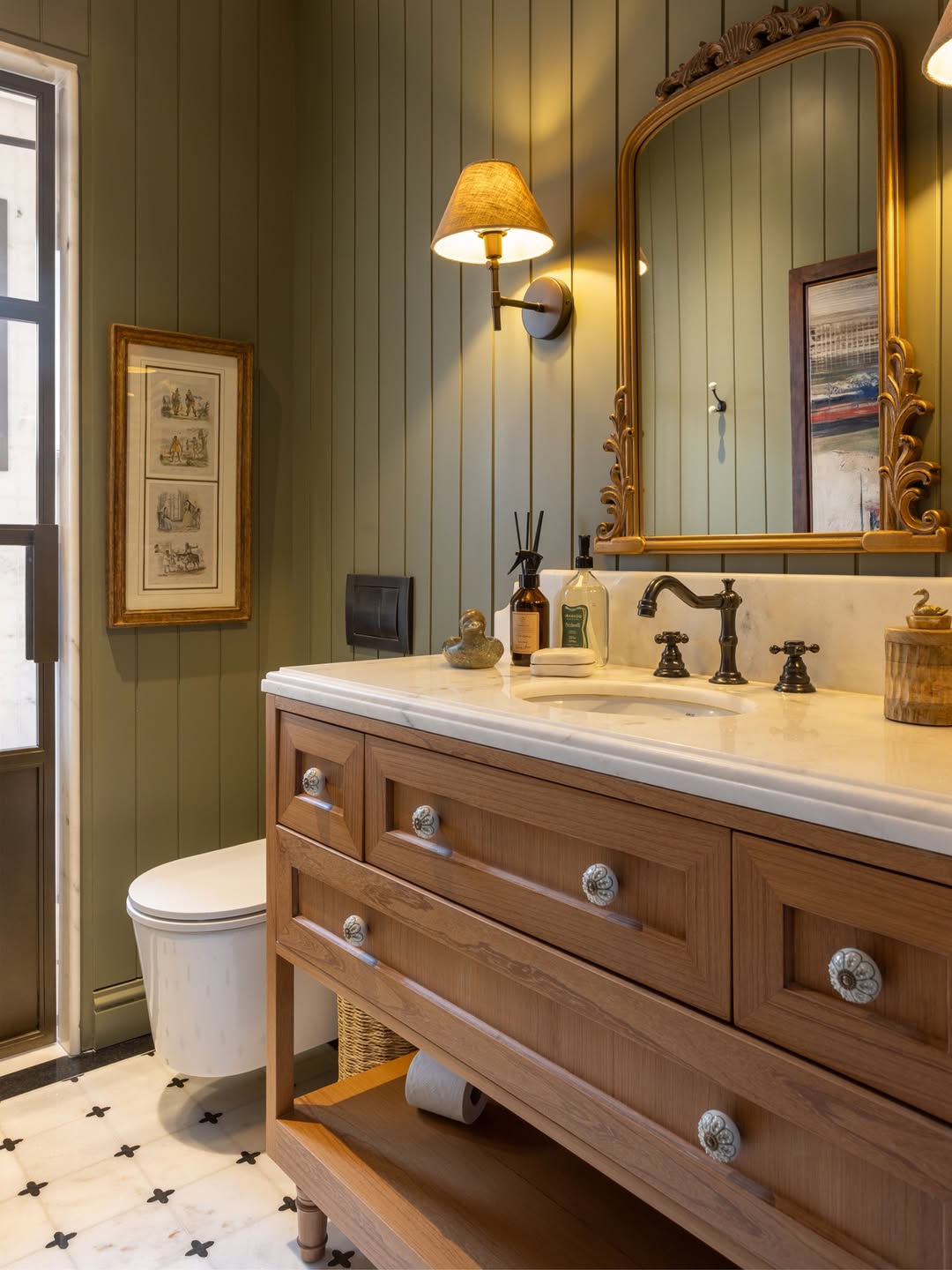 Paneled olive walls and a carved mirror frame set the stage for this warm, storybook-worthy bath. Drawer fronts feel extra charming thanks to ceramic floral knobs, turning everyday storage into a decorative moment. An open shelf underneath keeps essentials in reach while softening the formality. The whole setup glows like golden hour indoors.