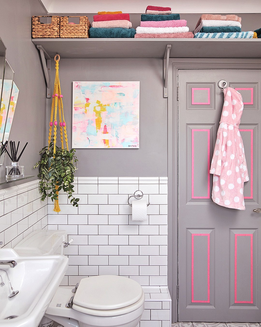 A single open shelf turns this tiny bathroom into a full-blown mood board. Stacked towels in candy colors double as decor, while baskets tuck away the not-so-pretty stuff. Painted trim and a polka-dot robe bring the fun all the way to the door. Bonus: zero square footage lost to bulky storage.