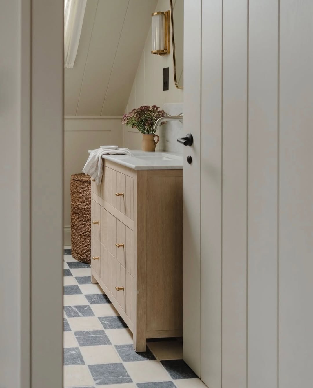 Natural wood drawers with dainty brass pulls feel right at home in this tucked-away nook. Sloped ceilings and panelled walls give the space a cozy, cottage-core edge without skimping on function. A lidded basket keeps laundry or extras neatly out of sight. It’s storage that blends in, not stands out.