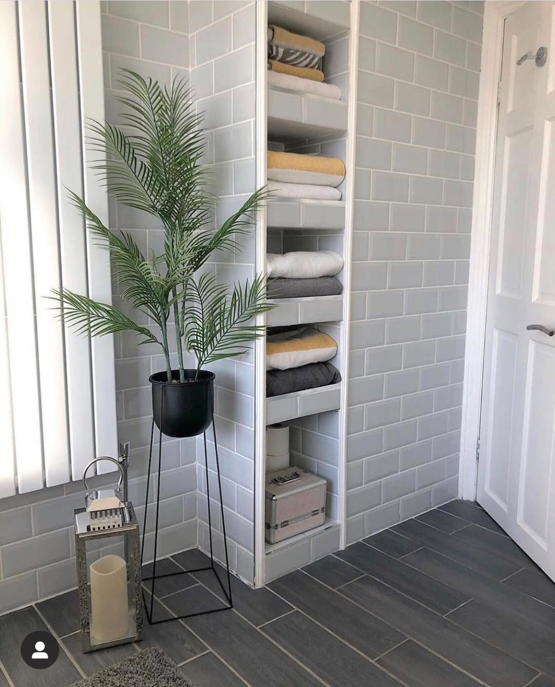 Skip the clunky storage tower—this bathroom leans into vertical built-ins that feel tailored, not tacked on. Each cubby neatly corrals rolled towels in soft greys and warm mustards, turning everyday items into decor. Glossy subway tiles keep the backdrop clean and calm. Bonus move: the tall plant adds life without crowding the floor.