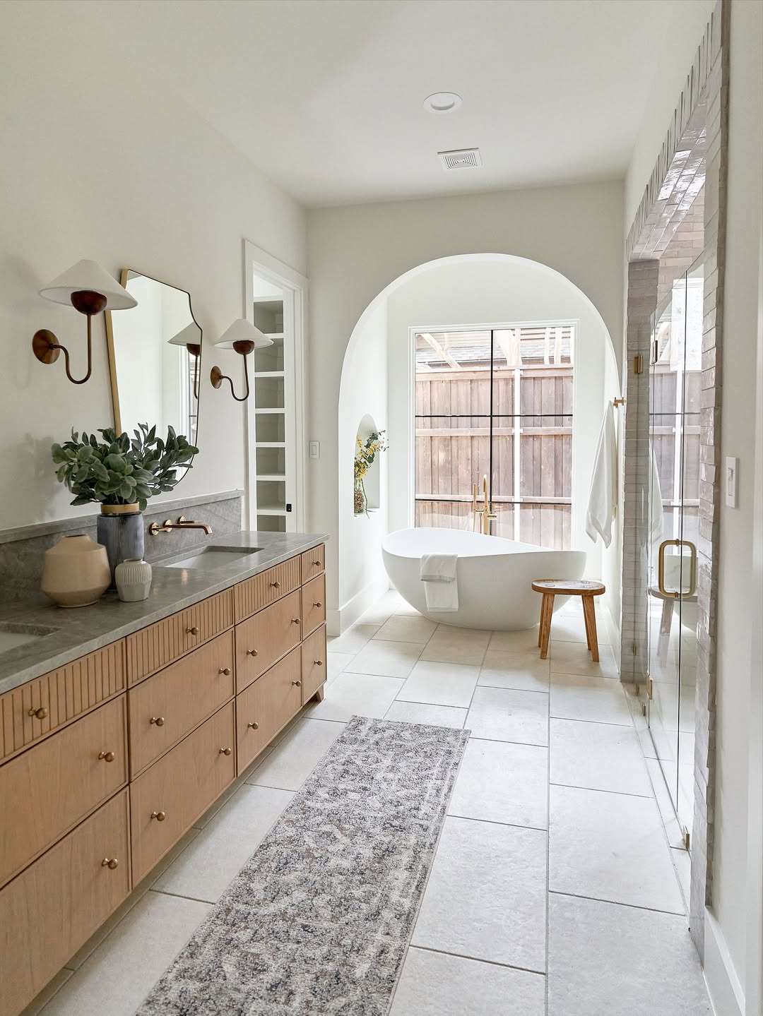 Slatted drawer fronts and soft brass hardware give the vanity a custom, crafted feel—plenty of storage, zero visual bulk. A graceful arch frames the soaking tub like a scene from a spa retreat, letting natural light flood the space. Wall-mounted faucets and slim mirrors keep the mood light and linear. Even the rug knows how to relax.
