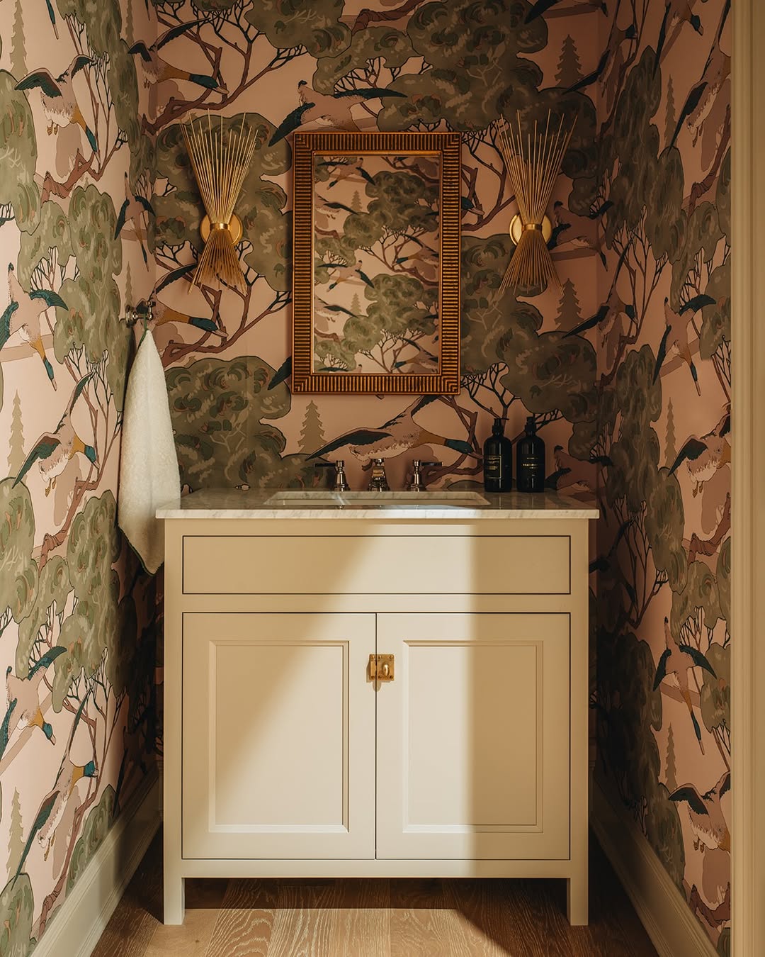 Peep the wallpaper—literally. Vibrant pheasants and treetop scenes wrap this powder room in maximalist charm, setting the stage for a crisp ivory vanity with understated storage. Fluted sconces and a matching mirror frame add golden glamour without taking attention off the walls. It’s a tiny space that swings big—and nails the landing.