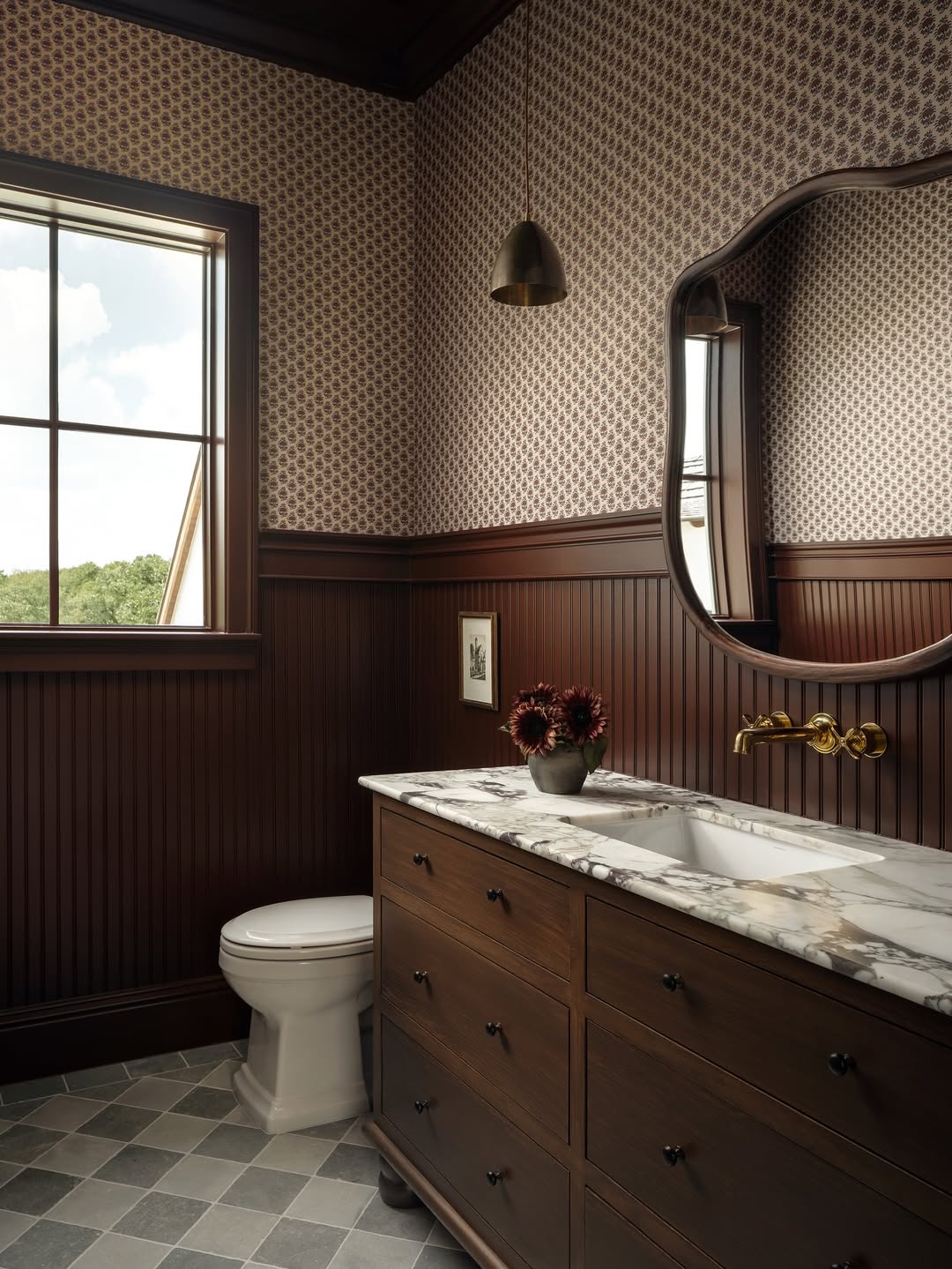 Deep wainscoting and a moody pattern stretch this powder room into full vintage drama mode. A curvy mirror and brass tap bring softness and shimmer to the structured lines. Storage goes stealth with slim black knobs and a marble counter that looks straight out of an old-world manor. Small space, big story.