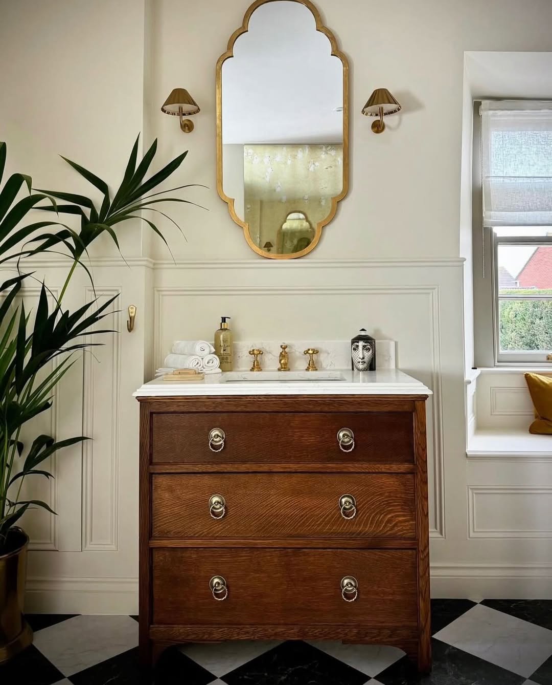 Rich walnut panels and unlacquered brass give the vanity wall a dose of vintage cool. The checkerboard marble floor adds just the right amount of pattern without overwhelming the space. Arched mirrors framed in gold echo the warmth of the wood while stretching the room vertically. It’s sharp, storied, and seriously chic.