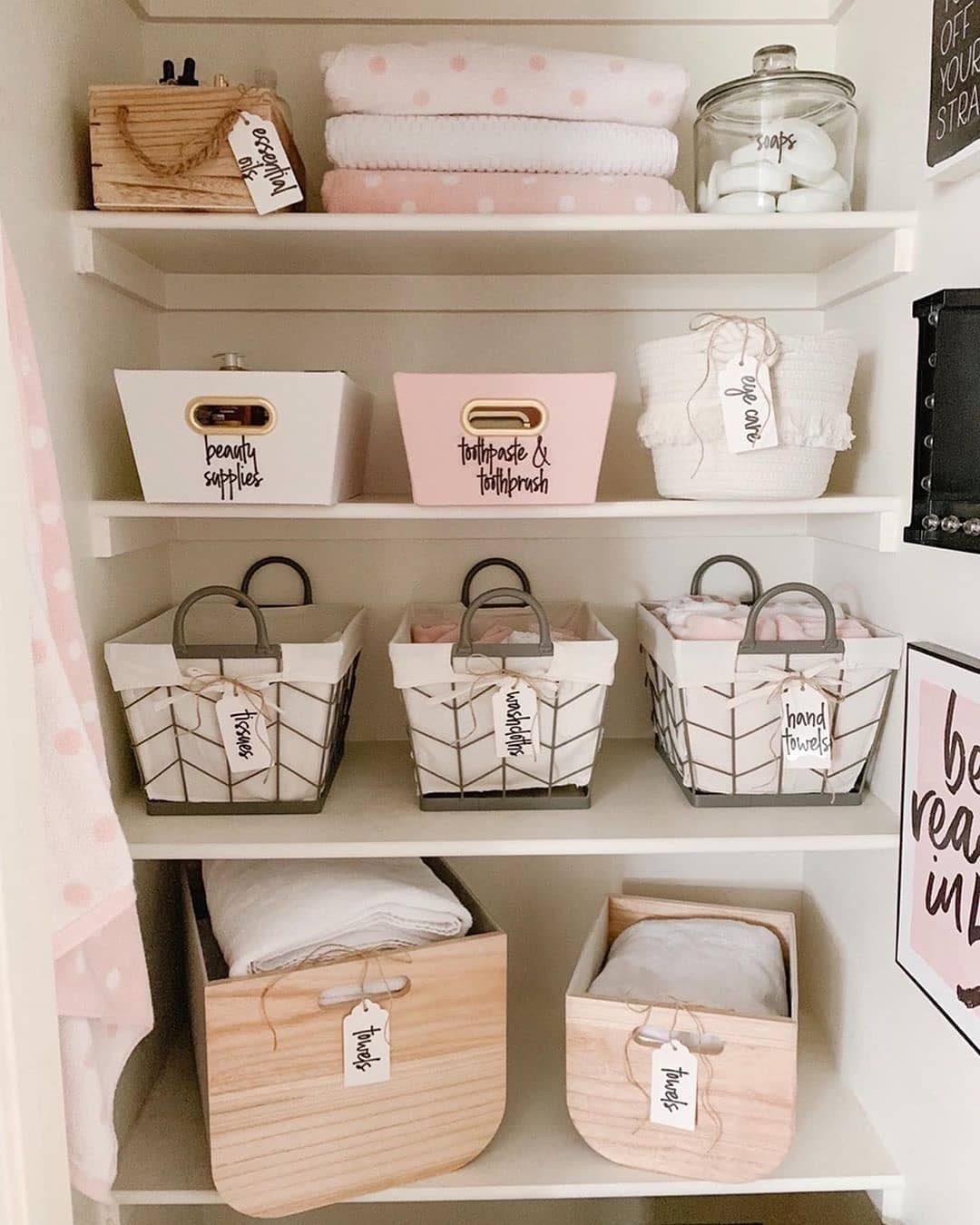 Everything has its place—and a cute label to prove it. This bathroom storage setup takes a page from the home edit playbook, swapping chaos for curated bins in blush and white. Mixed textures like wire, wicker, and soft wood keep it from feeling too matchy-matchy. And yes, even the cotton balls got their own jar.