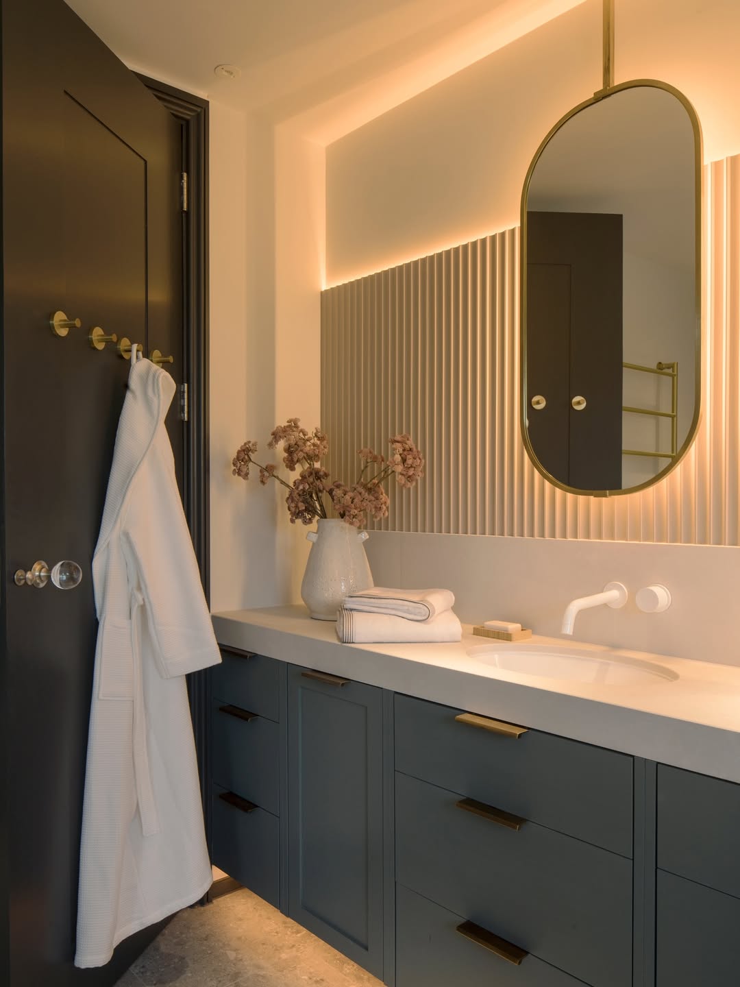 Soft lighting steals the scene here—tucked behind fluted paneling and wrapped around an elegant oval mirror. The navy vanity grounds the space, while brass hardware adds just the right touch of luxe. Even the faucet goes minimalist, blending cleanly into the wall. Proof that bathroom storage can be moody and modern.