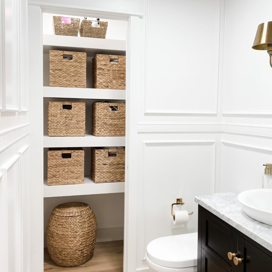 These built-in shelves go full spa-mode thanks to matching seagrass baskets that hide everything but the calm. The tight grid layout makes the storage feel intentional, not improvised. Crisp white paneling keeps things airy, while brass and marble accents bring in just enough polish. No chaos, no problem.