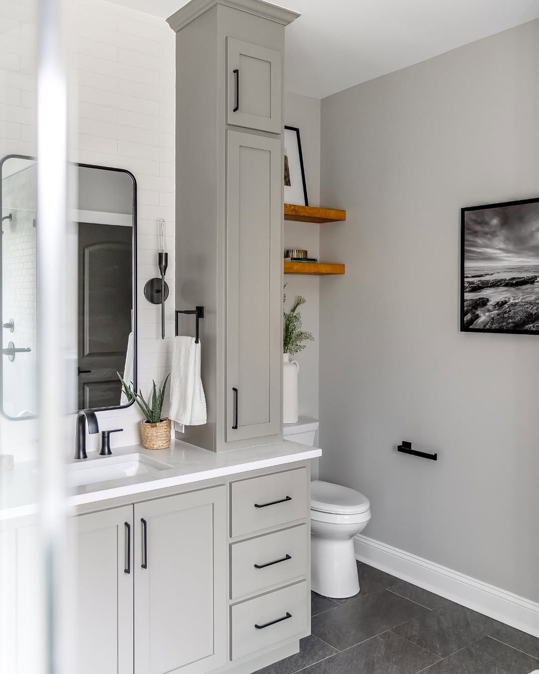 Here’s proof that bathroom storage can be tall, sleek, and totally unbothered. The full-height tower adds serious vertical function without eating into floor space. Matte black hardware pops against soft grey cabinetry, echoing the frame of the modern mirror. Floating wood shelves in the corner break up the monotone and soften the look.