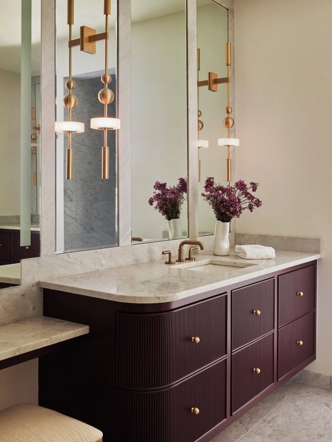 Fluted drawer fronts in a rich wine tone set the mood—bold but totally refined. Brass fixtures and globe pendant lights bring serious old-school glamour without veering into retro overload. The marble countertop softens the palette and adds a luxe, timeless contrast. Storage looks sleek, but those deep drawers mean it’s still wildly functional.