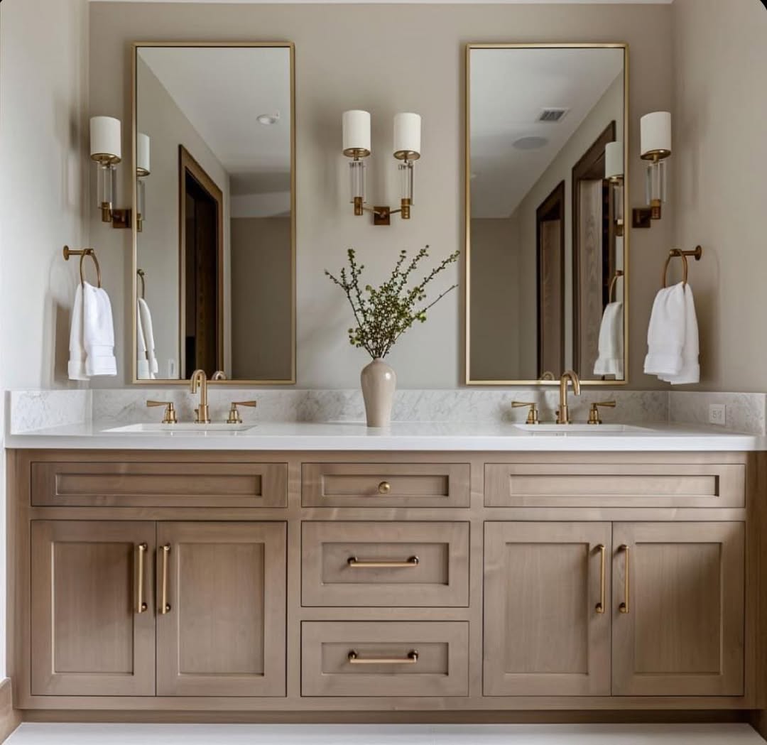 This double vanity nails the balance game—twin mirrors, twin sconces, twin faucets, all perfectly aligned. The warm taupe cabinetry brings a quiet sophistication, while brass hardware adds just enough shine. Deep drawers and generous counter space keep clutter out of sight. It’s calm, it’s cohesive, and it works like a charm.