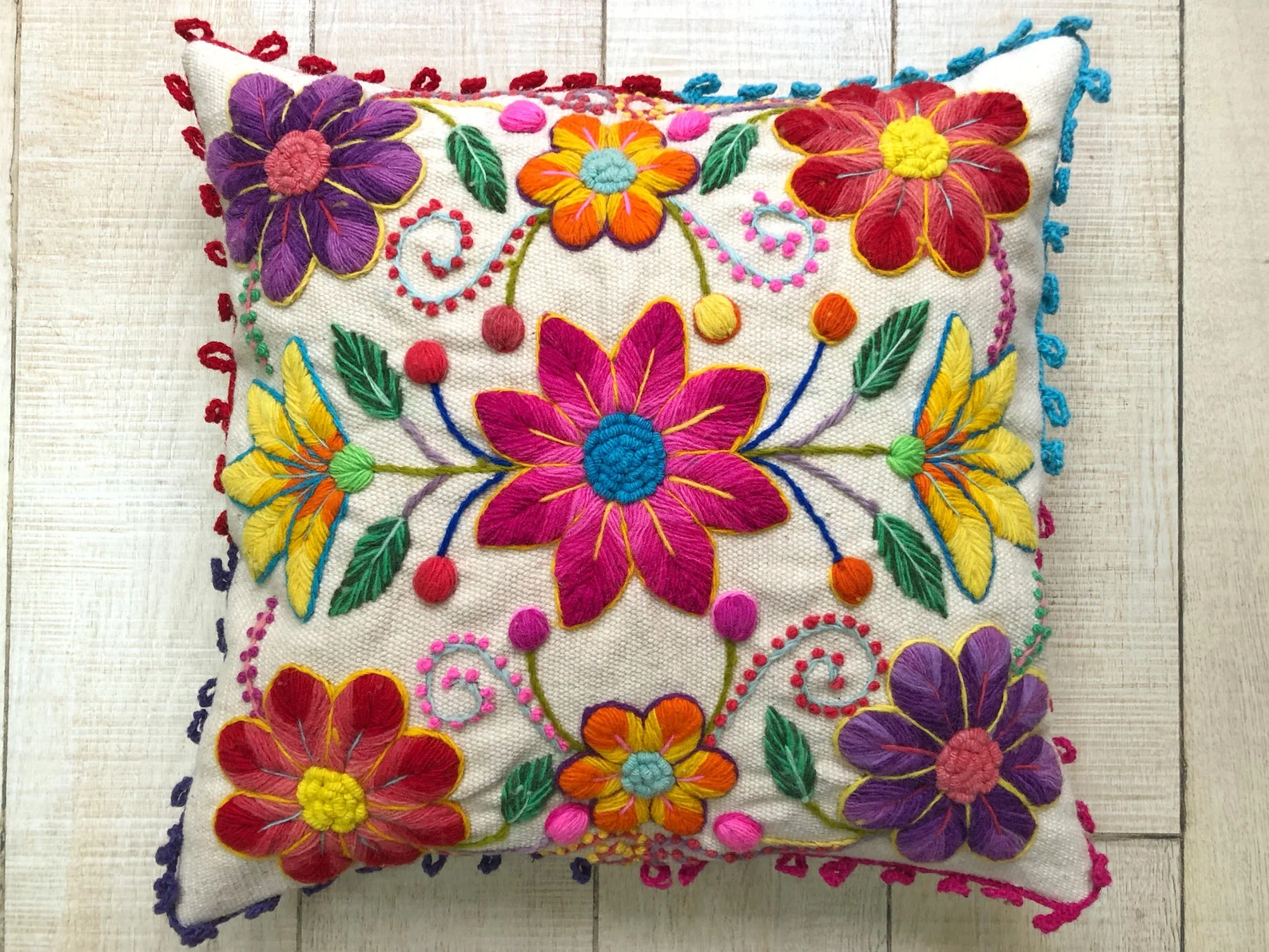 Vibrant hand embroidery turns this floral pillow cover into a work of art for your bed or sofa. Intricate stitching, playful tassel edges, and rich color bring global, boho charm to neutral spaces. Style it as a statement accent or mix it with solids to let the detailing shine. Handmade on Etsy for ₹6,533, it’s a special piece that adds craftsmanship and color in one easy upgrade.
