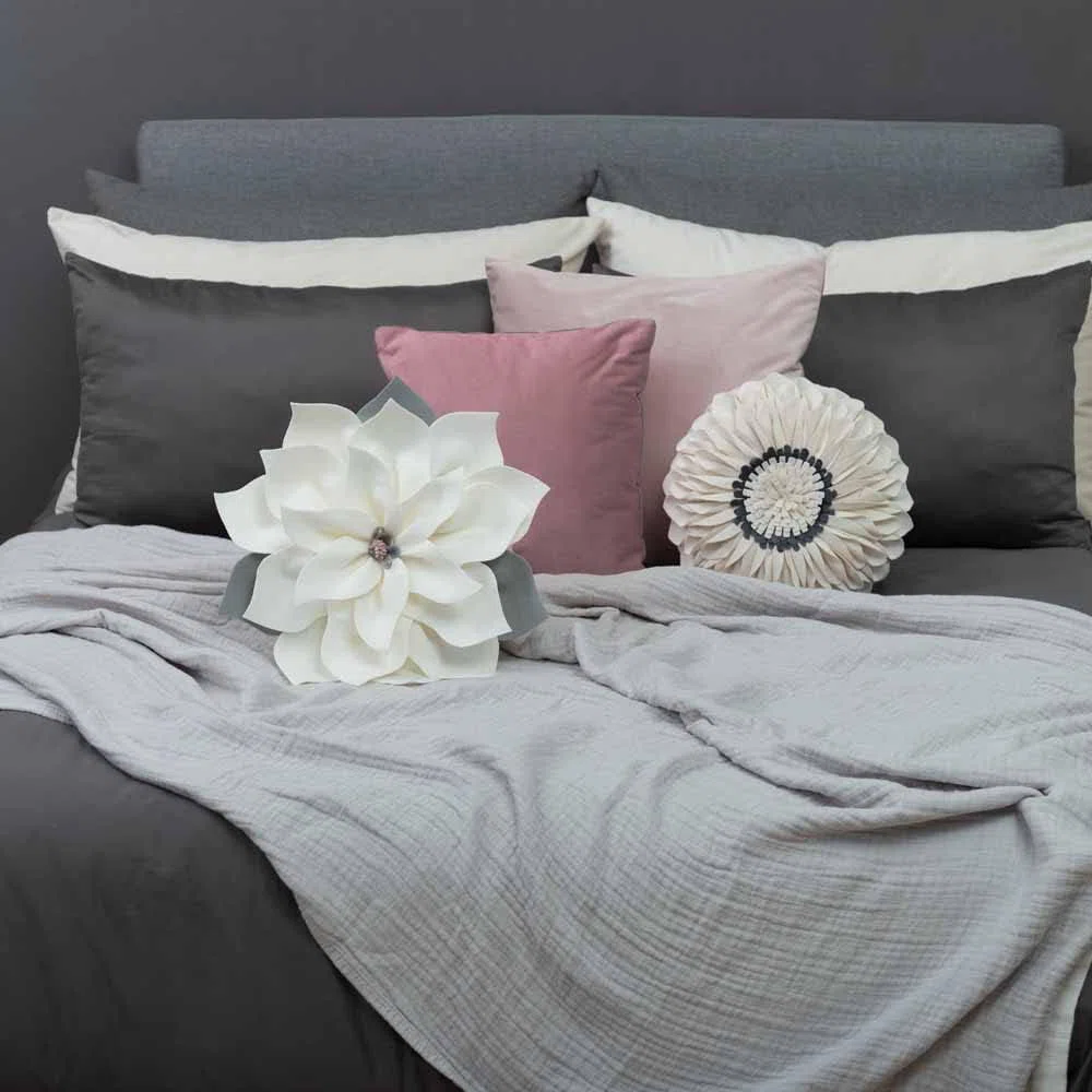 A: Pairing flower pillows with neutral cushions and solid-colored throws keeps the look balanced. Choosing muted shades like cream, blush, sage, or dusty blue makes them feel more sophisticated. Limiting the number of flower pillows to one or two per space also helps maintain a mature, polished look.