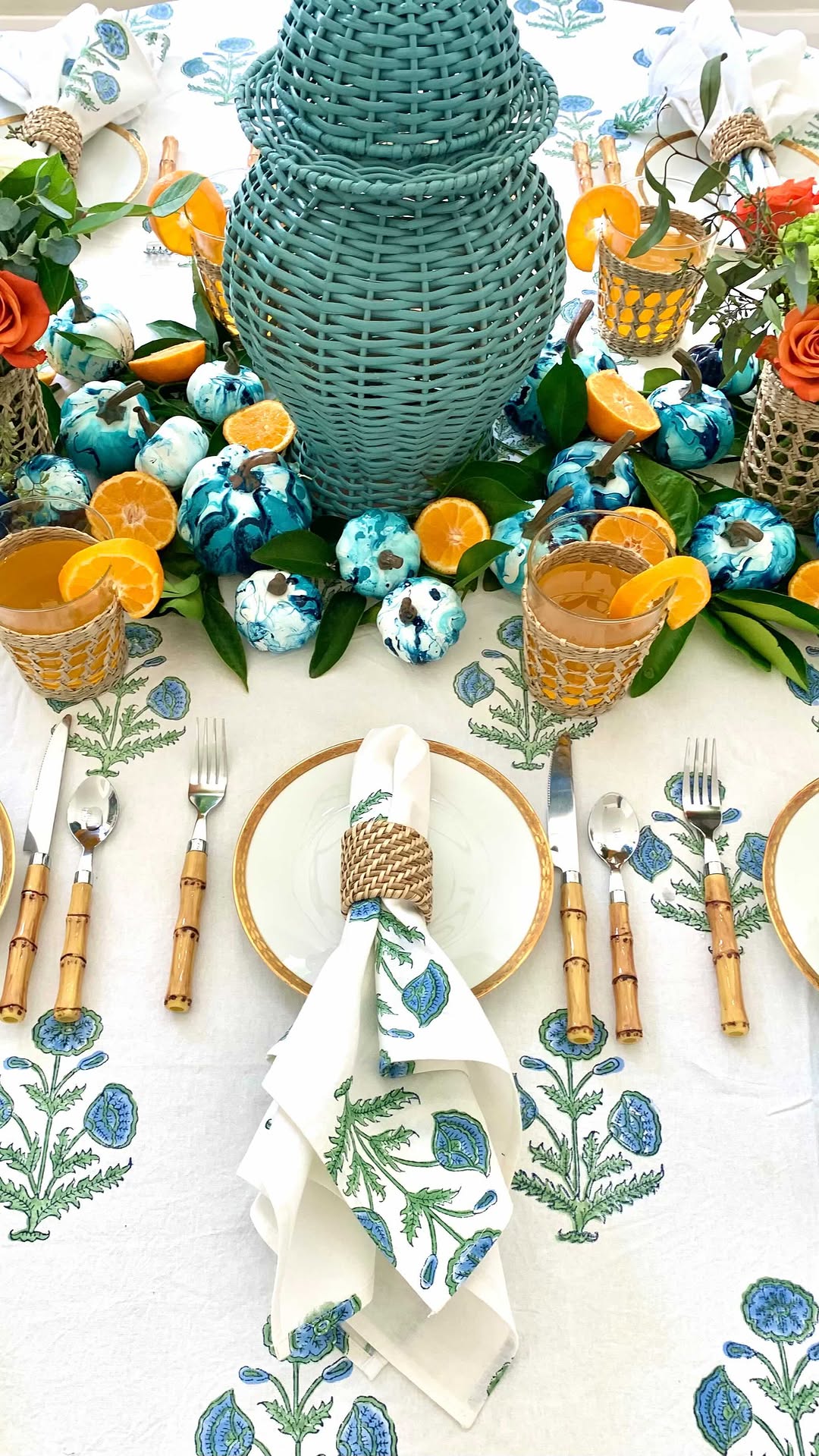 Marbled pumpkins and fresh oranges bring zing to a tablescape that skips the usual autumn tones. Woven textures in the charger glasses and oversized urn add a little global flair, while botanical prints keep things grounded. It’s fall brunch with vacation energy.