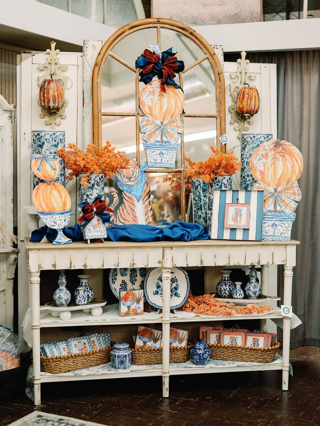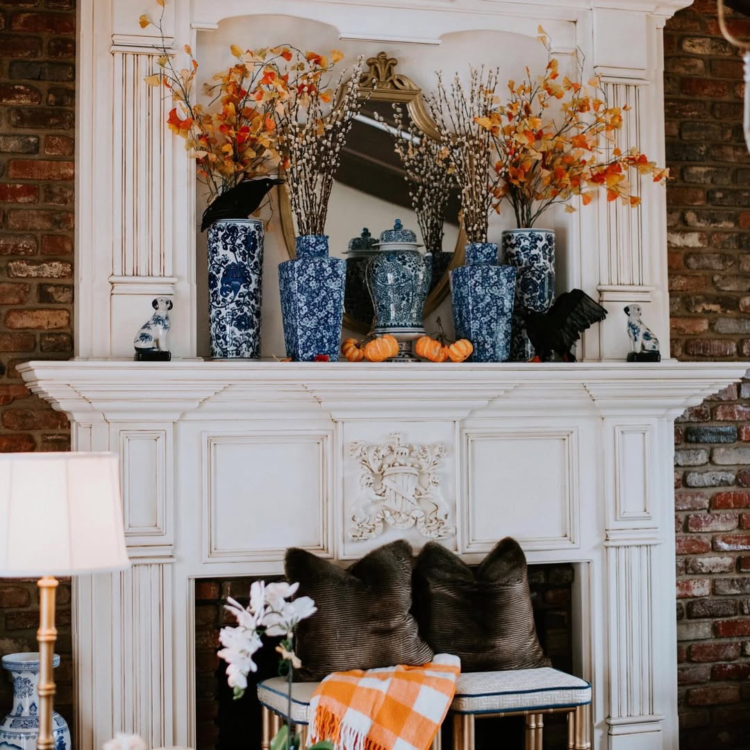 Forget the hay bales—this fall setup is thinking in porcelain. Hand-painted pumpkins in blue-and-white planters play off ginger jars and Delft-style vases, turning a humble console into a harvest-ready vignette. The orange florals pop against the navy drape, making it all feel intentional, not kitschy. Even the tiger cutout leans luxe instead of circus.