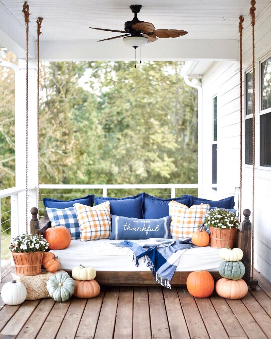 A hanging bed swing loaded with gingham and navy pillows makes this spot feel like a fall nap waiting to happen. Stacked pumpkins in soft greens, creams, and oranges echo the cozy palette without overwhelming it. A “thankful” lumbar pillow anchors the message—this is autumn, simplified and snuggle-ready.