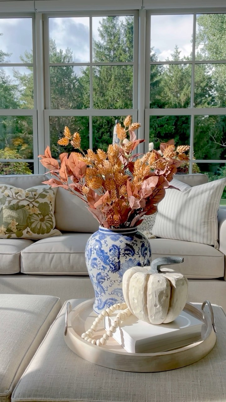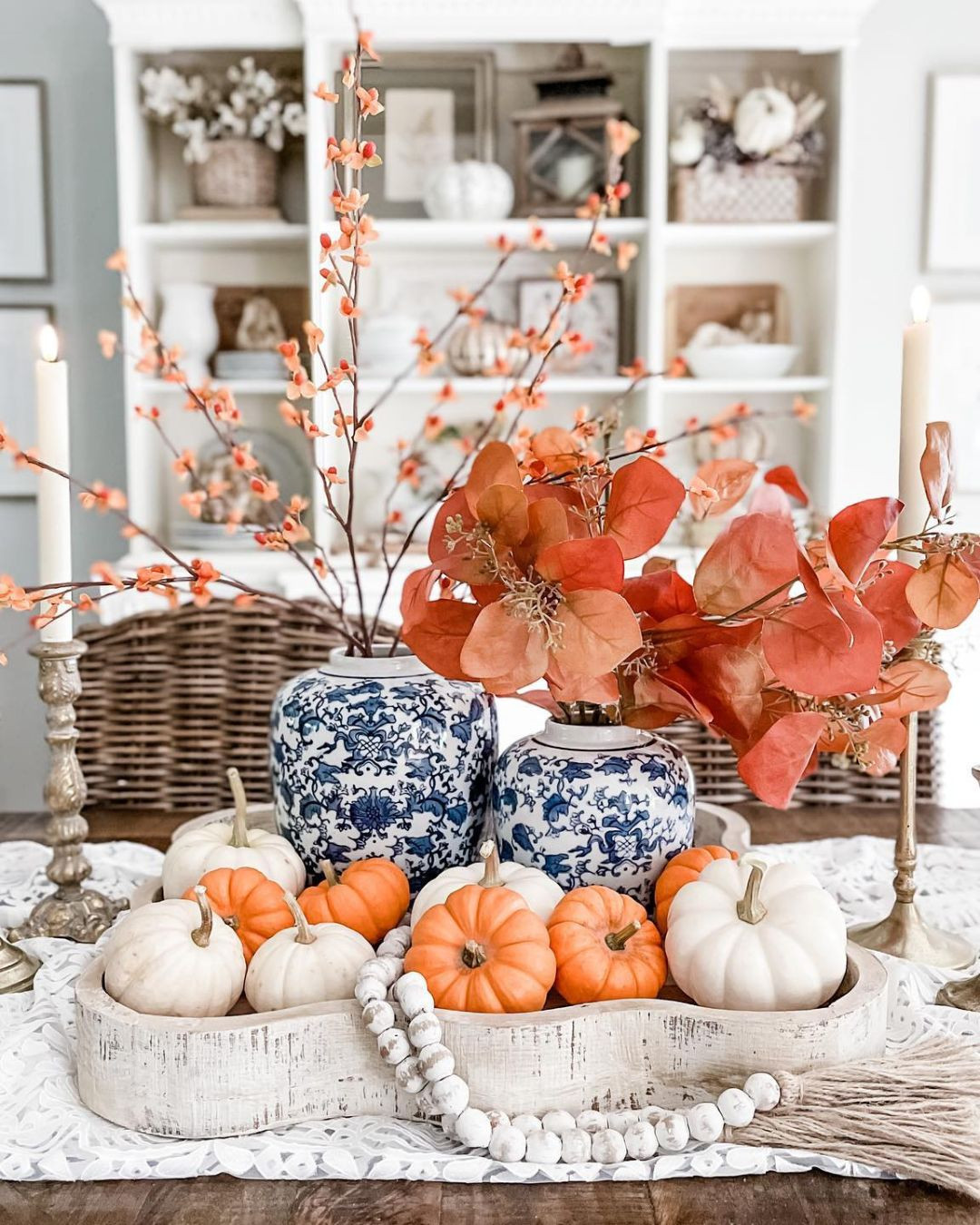 Bittersweet branches and mini pumpkins feel extra luxe against those blue chinoiserie vases. The whitewashed tray and bead garland keep things soft, not stuffy. It’s a perfect mix of crisp and cozy—like fall in a cashmere sweater. Bonus: no hay in sight.