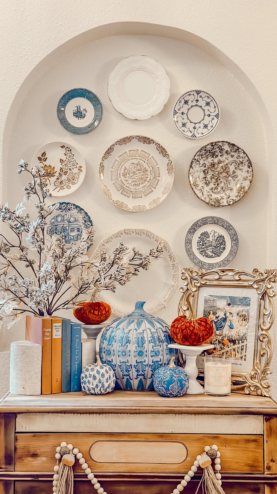 Patterned plates climb the wall like art, setting the tone for a perfectly layered tabletop moment. Stacked books, faux florals, and chinoiserie pumpkins lean vintage without feeling dusty. Orange velvet pumpkins add just enough spice to break up all that porcelain and cream. It’s curated, cozy, and quietly clever.