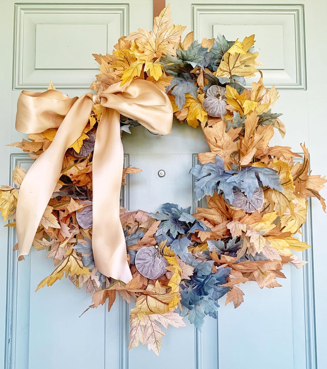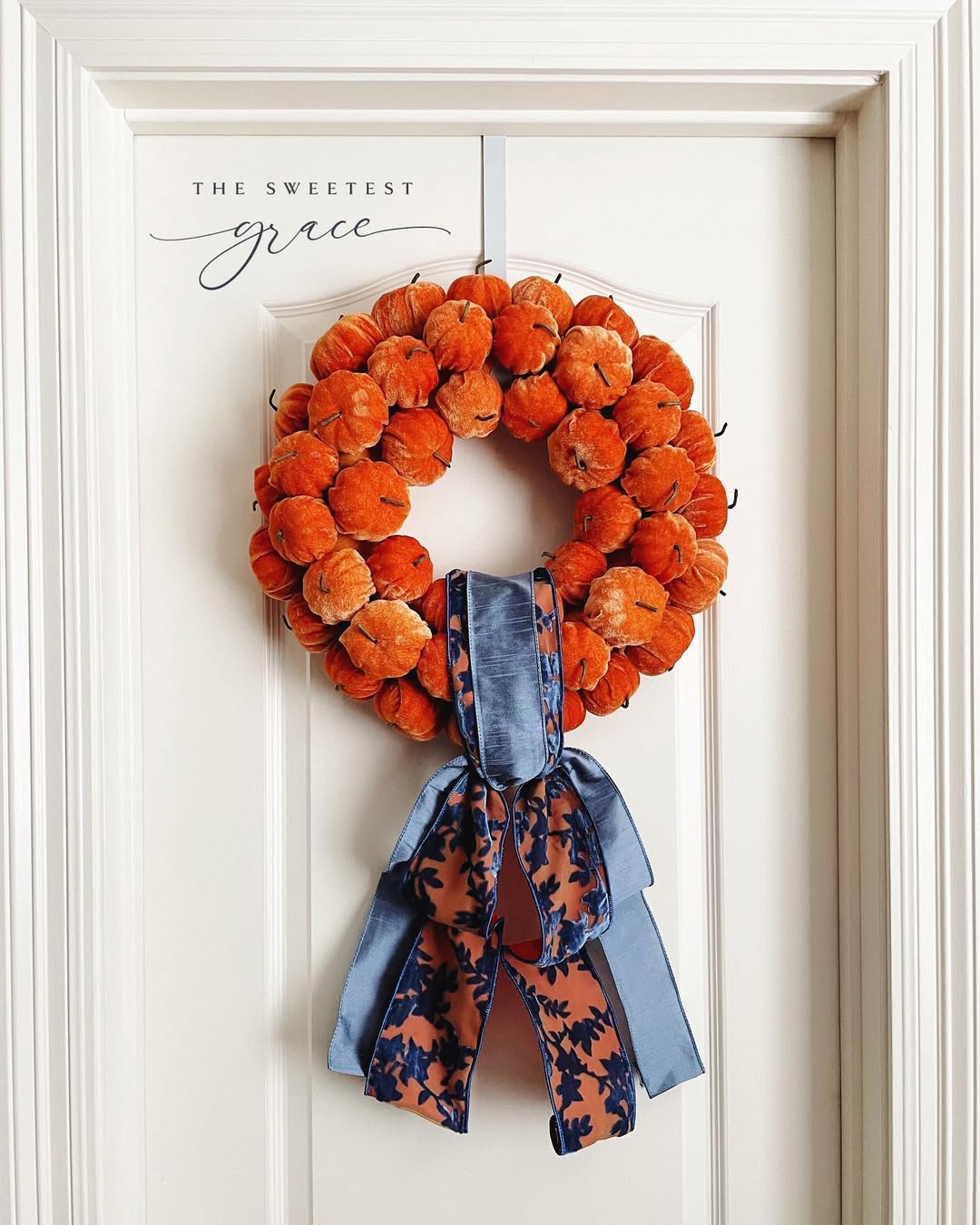 Dozens of plush orange pumpkins pack this wreath with texture, creating the coziest welcome imaginable. A dramatic bow in navy and blush brings a dose of moody glam, making it feel more boutique hotel than farmhouse porch. Talk about a statement-maker that’s still sweet.
