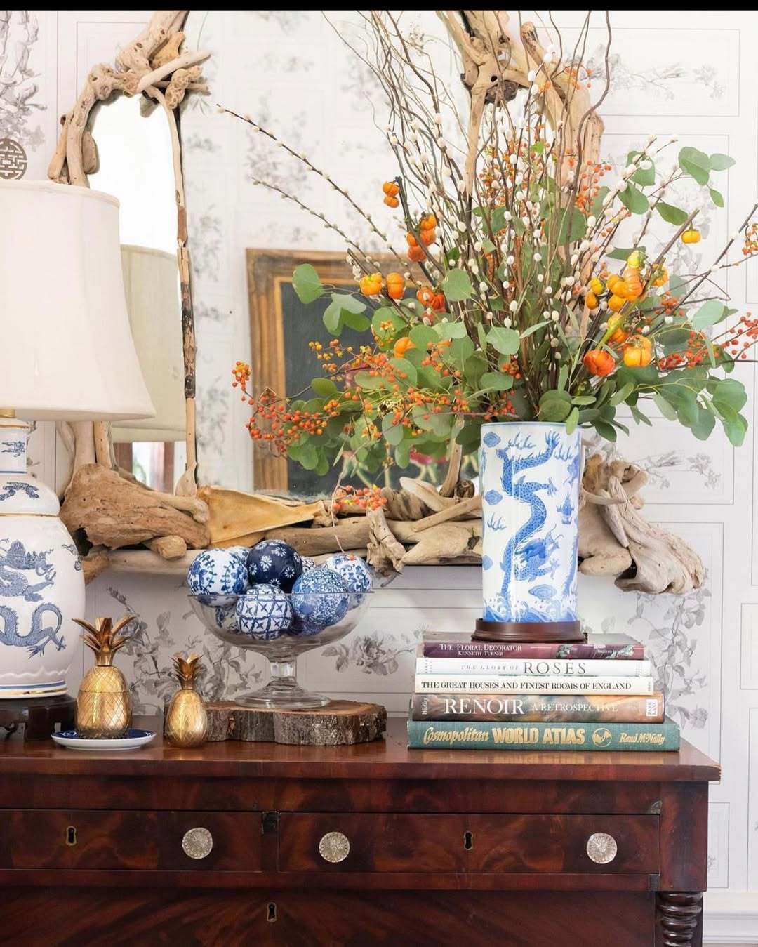 Bittersweet stems explode from a blue dragon vase, anchored by a driftwood-framed mirror and stacks of coffee table books. A bowl of patterned orbs nods to tradition without feeling too serious. Styling feels curated, not cluttered—and completely unexpected for fall.
