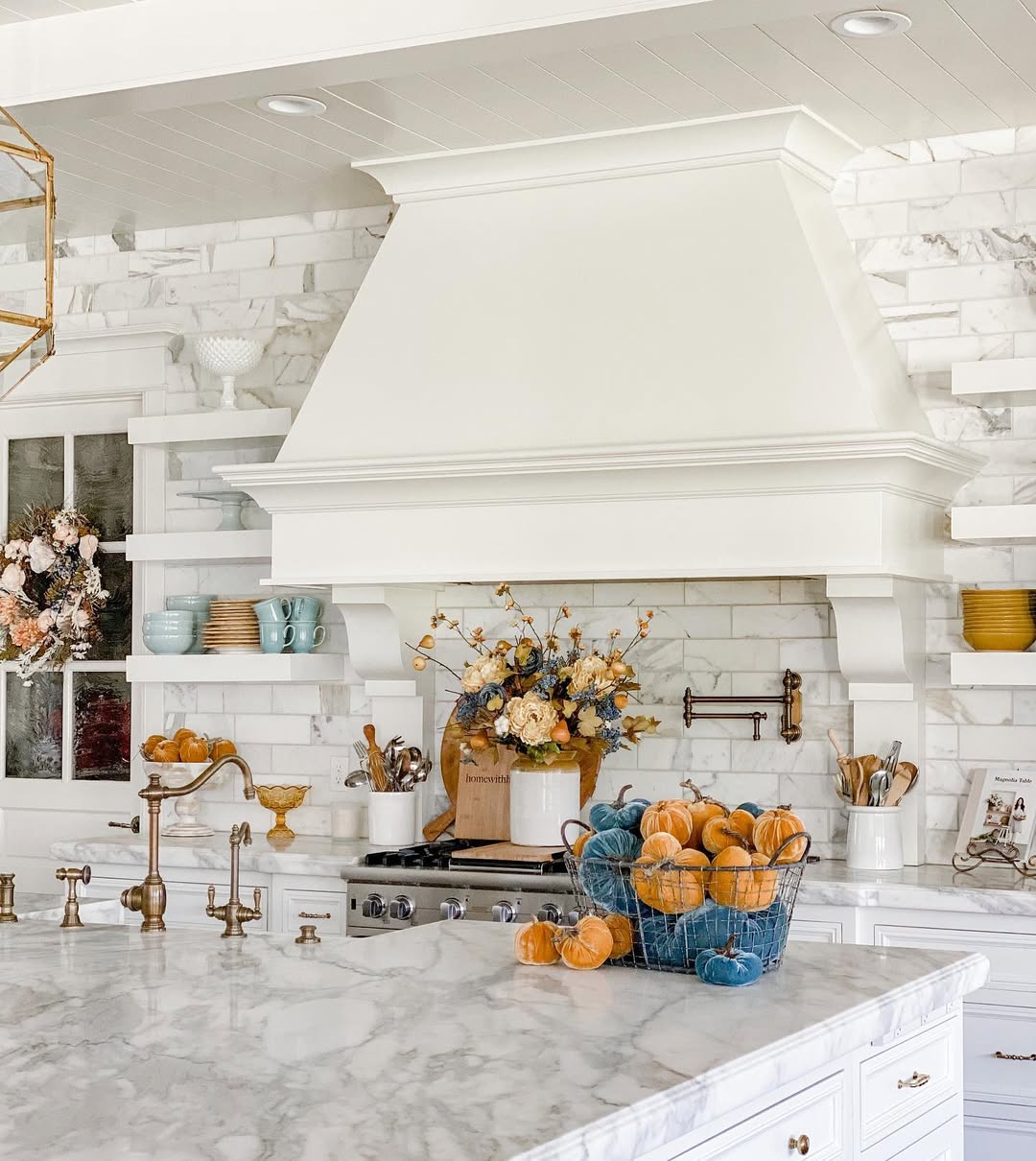 A marble-clad kitchen gets its seasonal moment thanks to a wire basket full of plush pumpkins in ochre and dusty blue. Neutral blooms near the range hood echo the palette without crowding the space. Subtle fall styling like this proves less is more—especially in a high-functioning space.