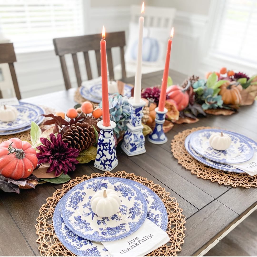 Blue-and-white china sets the tone, but it’s the matching taper holders that steal the spotlight. Mini white pumpkins on every plate add charm, while the sprawling centerpiece of pinecones, pumpkins, and dahlias keeps things grounded. A fresh twist on classic Thanksgiving table styling.
