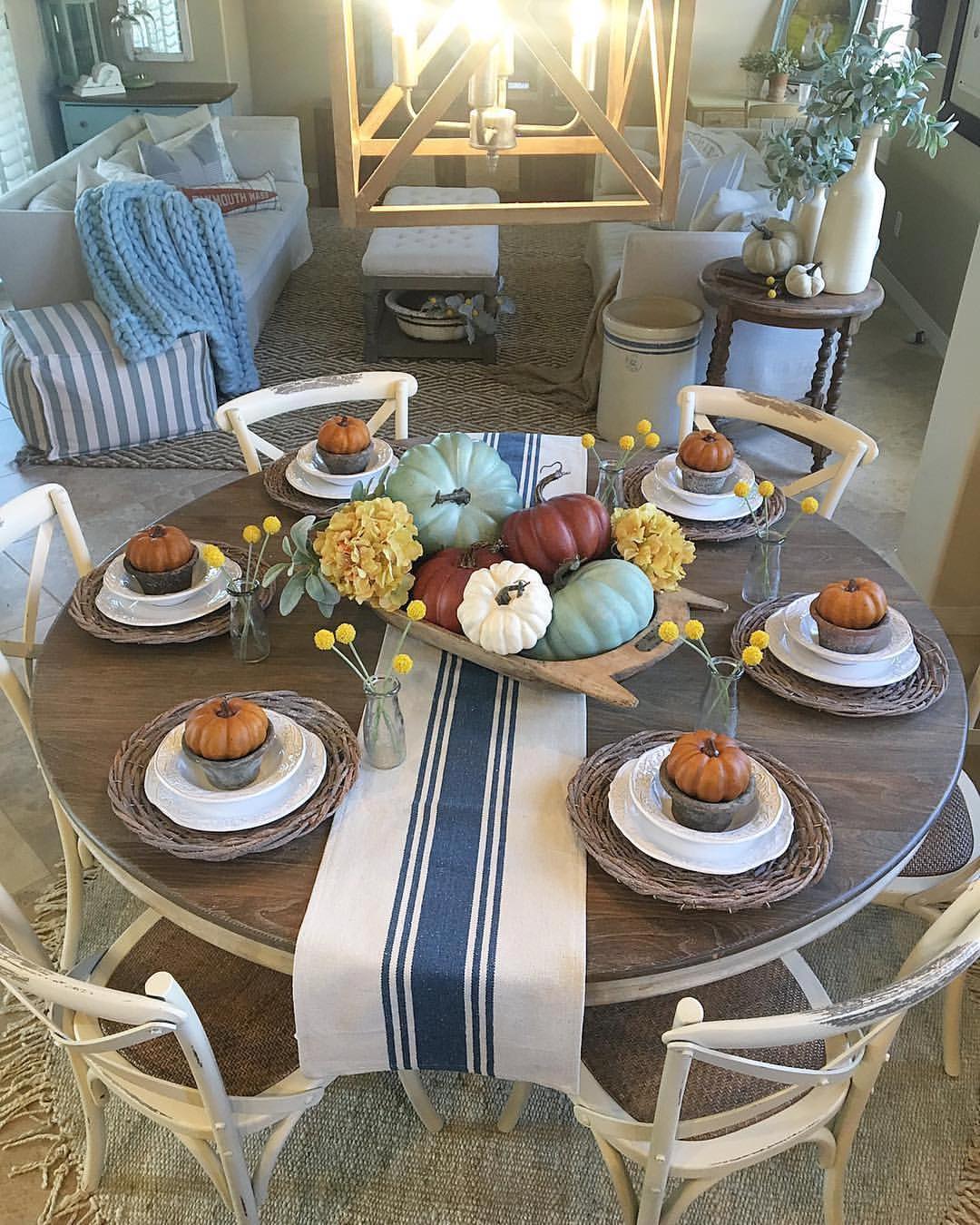 Muted pumpkins in sage, white, and rust spill from a dough bowl, instantly anchoring the round table. Woven chargers and ticking-stripe linens echo the home’s soft farmhouse energy. Bonus points for individual pumpkin bowls—because fall should always come with its own mini gourd.