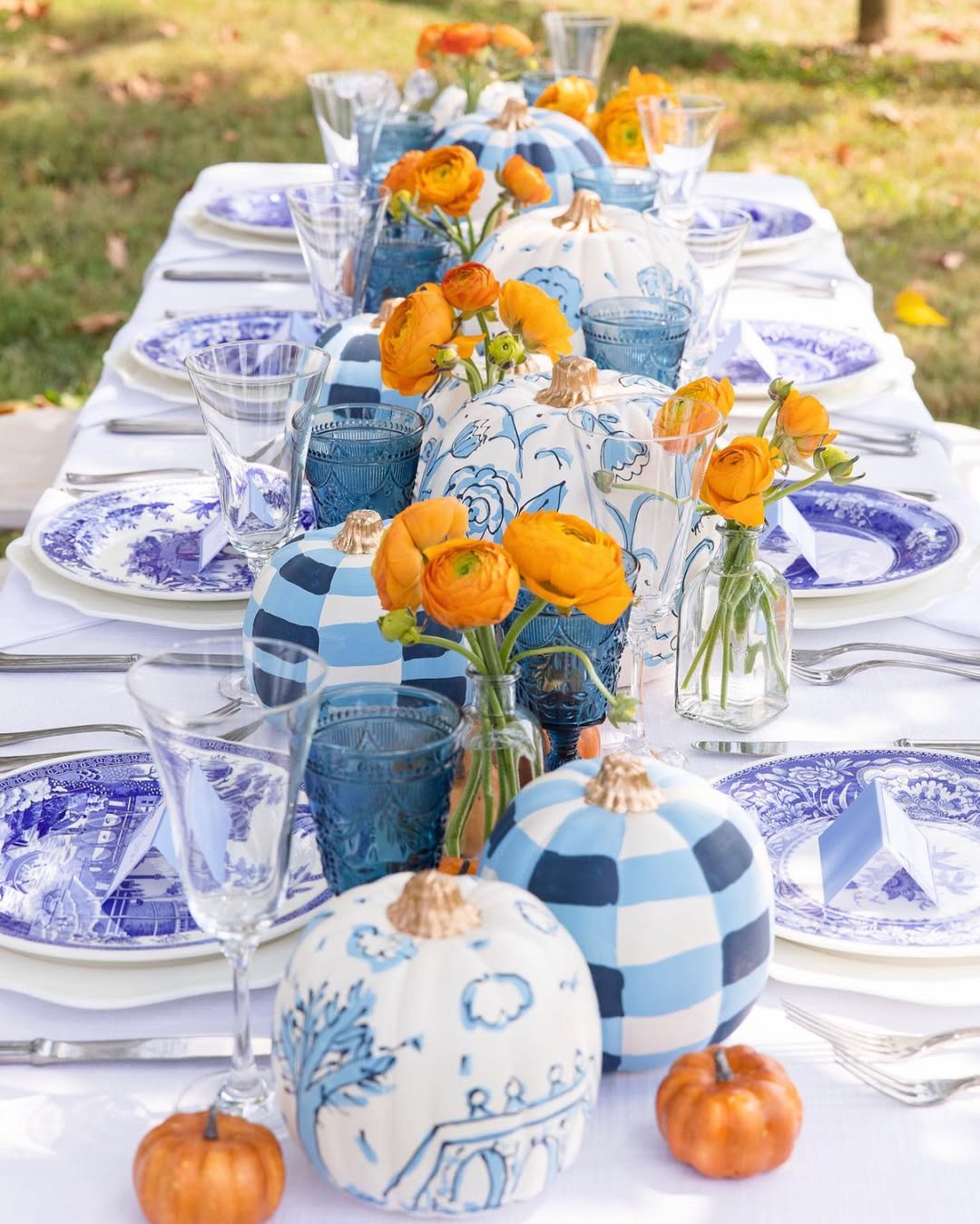 Hand-painted pumpkins in soft blues and chinoiserie patterns play off vintage plates and glassware for an outdoor table that’s both fun and refined. Bursts of orange ranunculus add warmth without overpowering the palette. Ideal for a sunny fall lunch that feels effortlessly styled.