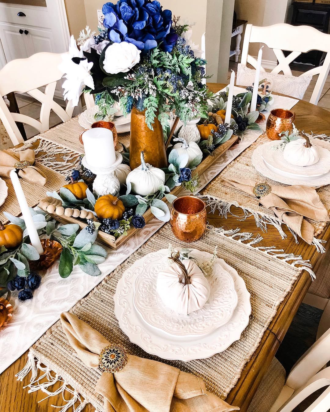 Ivory plates, burlap runners, and copper mugs set the foundation for this layered, rustic-luxe tablescape. Soft white and orange pumpkins nestle into greenery and deep blue florals, adding richness without heaviness. Elevated but totally relaxed—the kind of table that says “stay awhile.”