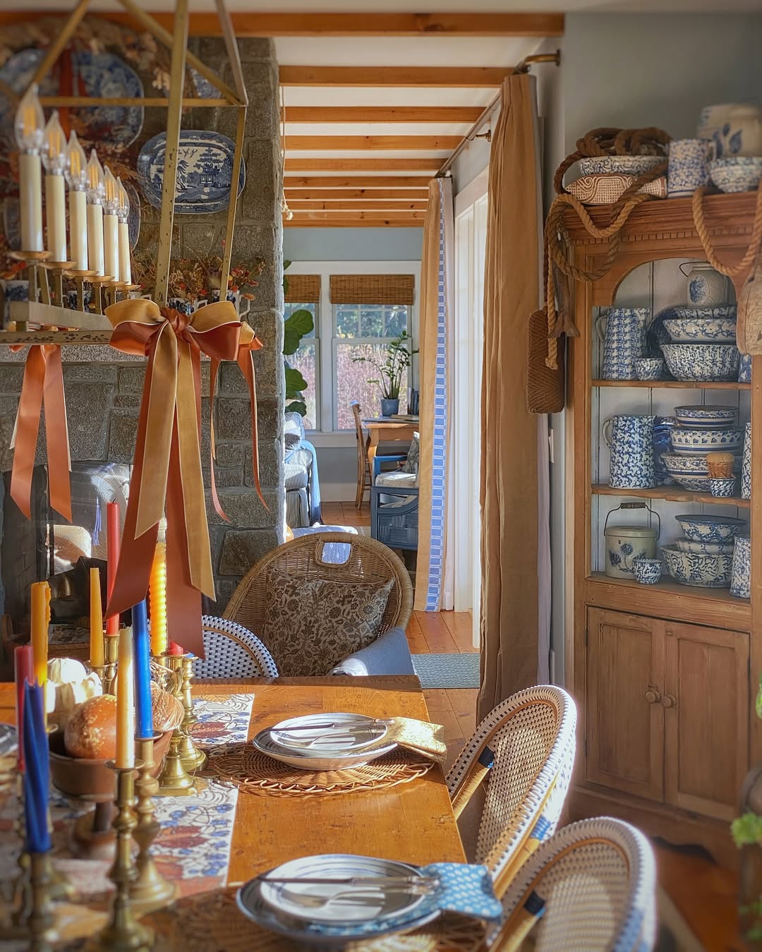 Layered blue china, glowing tapers, and amber ribbons set a warm, storybook mood in this inviting dining space. Woven textures and natural wood tones balance out the rich hues and vintage finds. A peek into the next room reveals even more cozy corners—because fall should feel like a well-loved novel.
