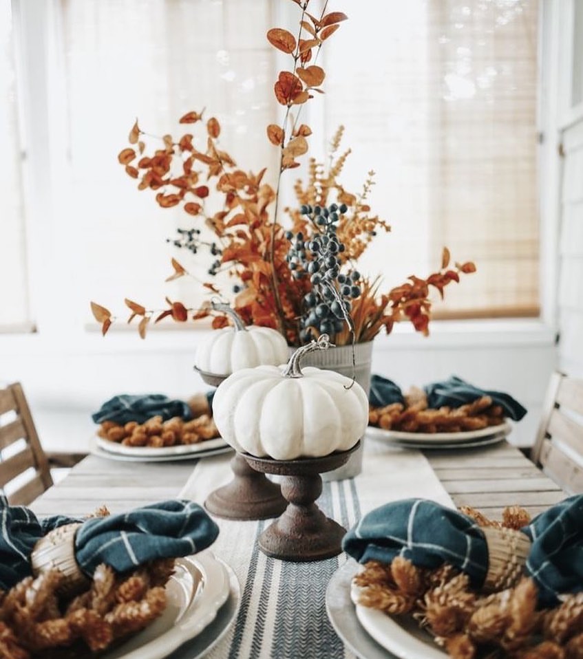 Creamy pumpkins on dark pedestals add height and drama without trying too hard. Burnt orange branches and deep navy napkins create a moody, modern color story that still feels grounded in fall tradition. Natural textures pull it all together—perfect for a crisp, candlelit dinner.
