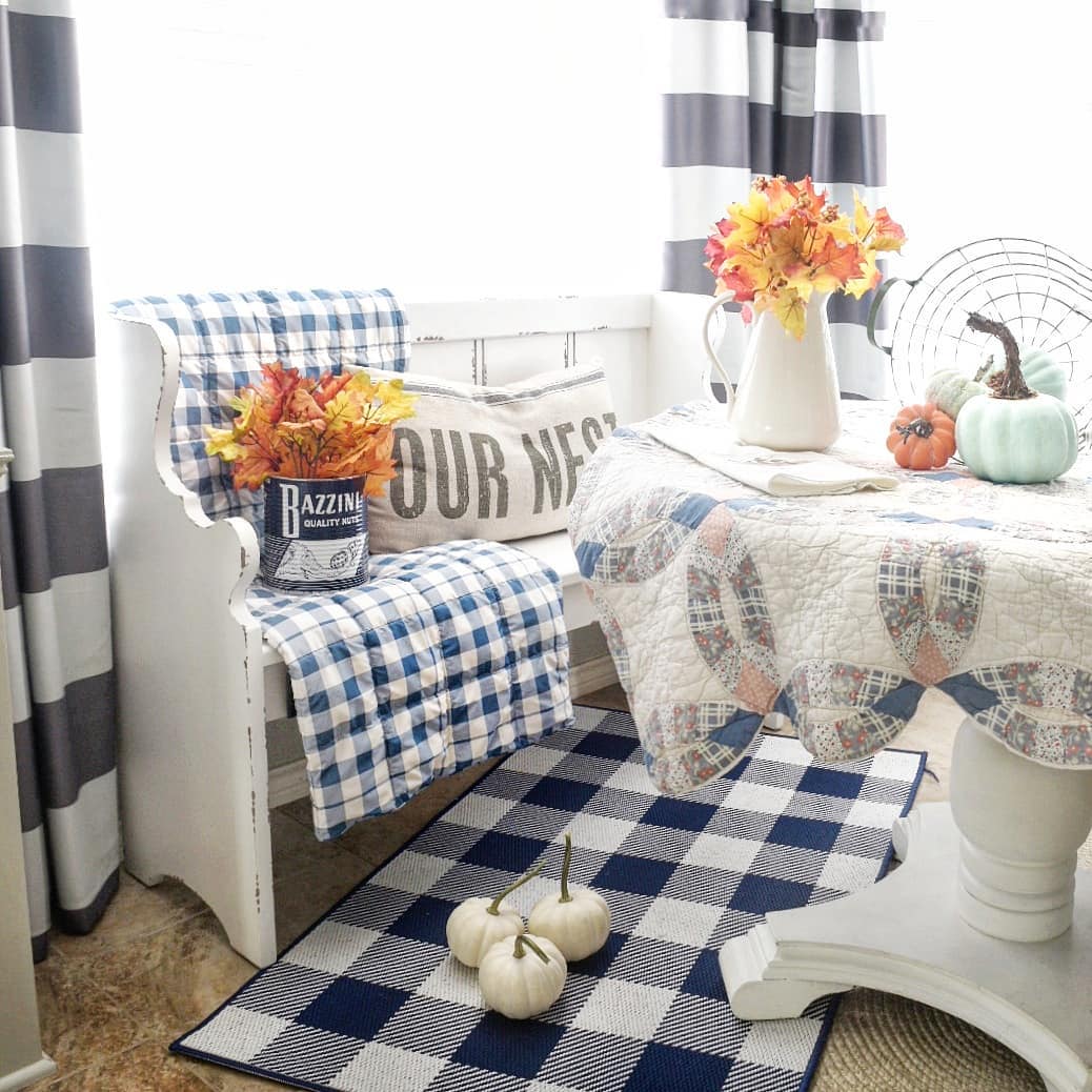 Gingham quilts, pieced table linens, and soft blue-green pumpkins bring serious charm to this sun-drenched nook. A “Our Nest” pillow and tin-can vase dial up the cozy without adding clutter. It’s grandma’s kitchen table meets Pinterest—sweet, simple, and perfectly fall.