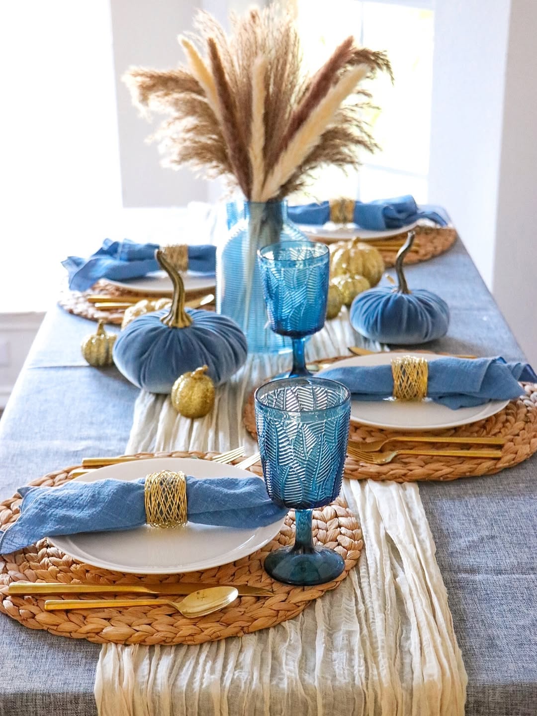 Pampas grass, denim blues, and velvet gourds set the stage for a fall table that’s breezy, not bulky. Rattan chargers ground the setting while gold flatware adds just enough glitz. It’s coastal grandma meets autumn harvest—and yes, it totally works. Skip the orange this year and go cool-toned cozy instead.