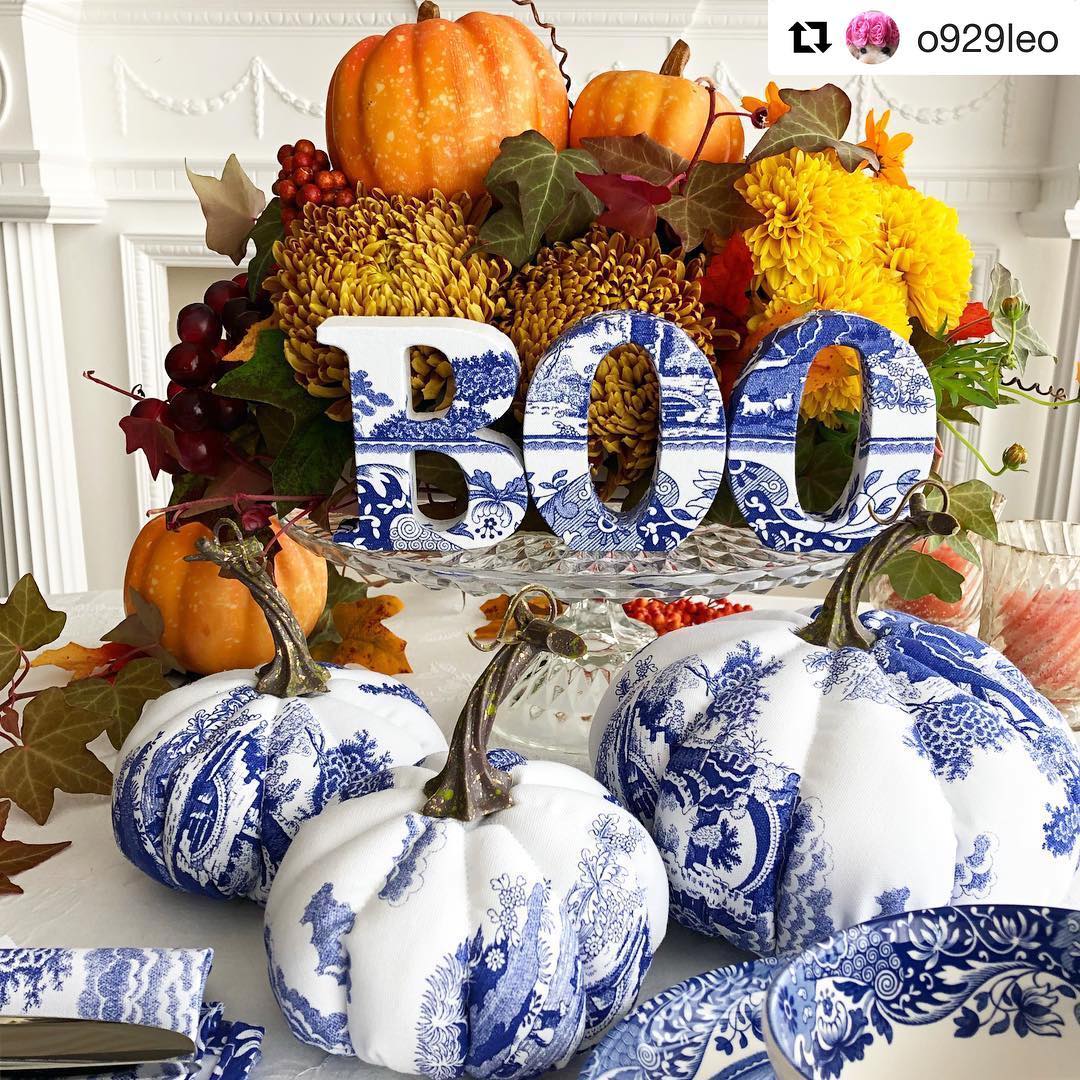 Turns out spooky season looks great in chinoiserie. These fabric-covered pumpkins (and the bold “BOO” sign to match) give Halloween a high-style twist. Tucked among classic orange mums and faux grapes, the whole thing feels fresh—not fussy. It’s all treat, no fright.