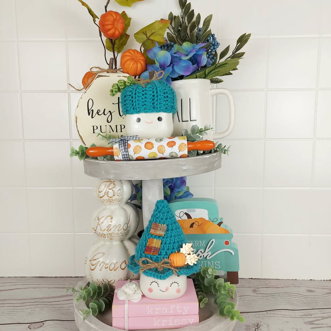 This tiered tray goes full storybook mode, complete with crocheted hats, mini rolling pins, and smiling faces. Pops of teal and tangerine keep the look playful but fall-friendly. It’s part kitchen, part kids’ craft—ideal for anyone who loves a little character with their coffee.