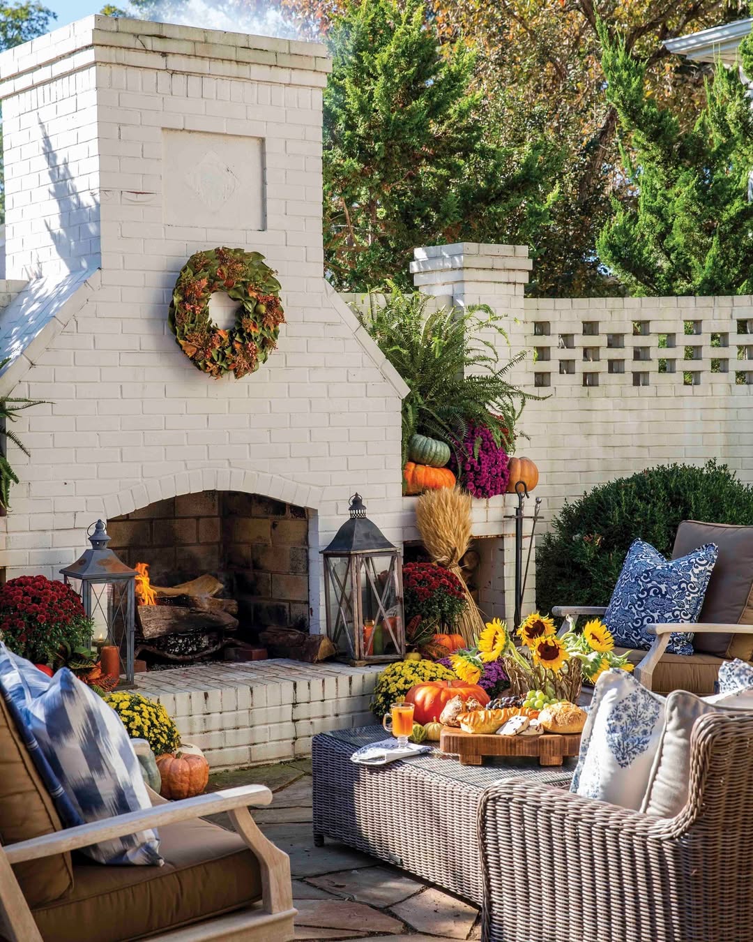 Crisp air, cozy chairs, and a roaring outdoor fireplace set the tone for peak autumn hosting. Mums, pumpkins, and sunflowers are styled low around the hearth, letting the clean white brick shine. Blue-and-white pillows add polish without clashing with the harvest palette. It’s giving cider-sipping season, elevated.