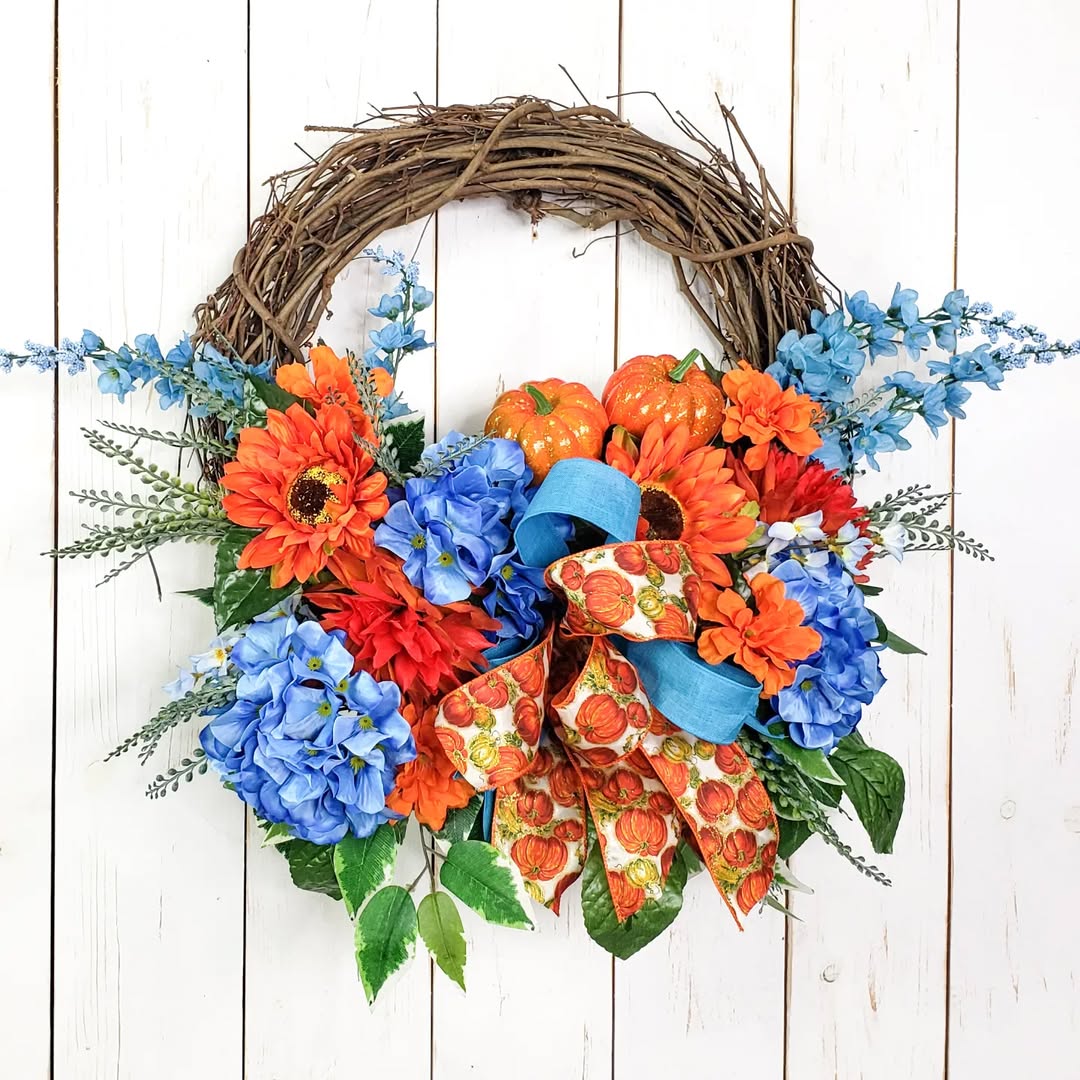Bold cobalt blooms take center stage against fiery orange florals and mini gourds in this cheerful front door moment. A pumpkin-printed ribbon leans playful, not precious, while the grapevine base keeps things grounded. Call it pumpkin spice with personality.