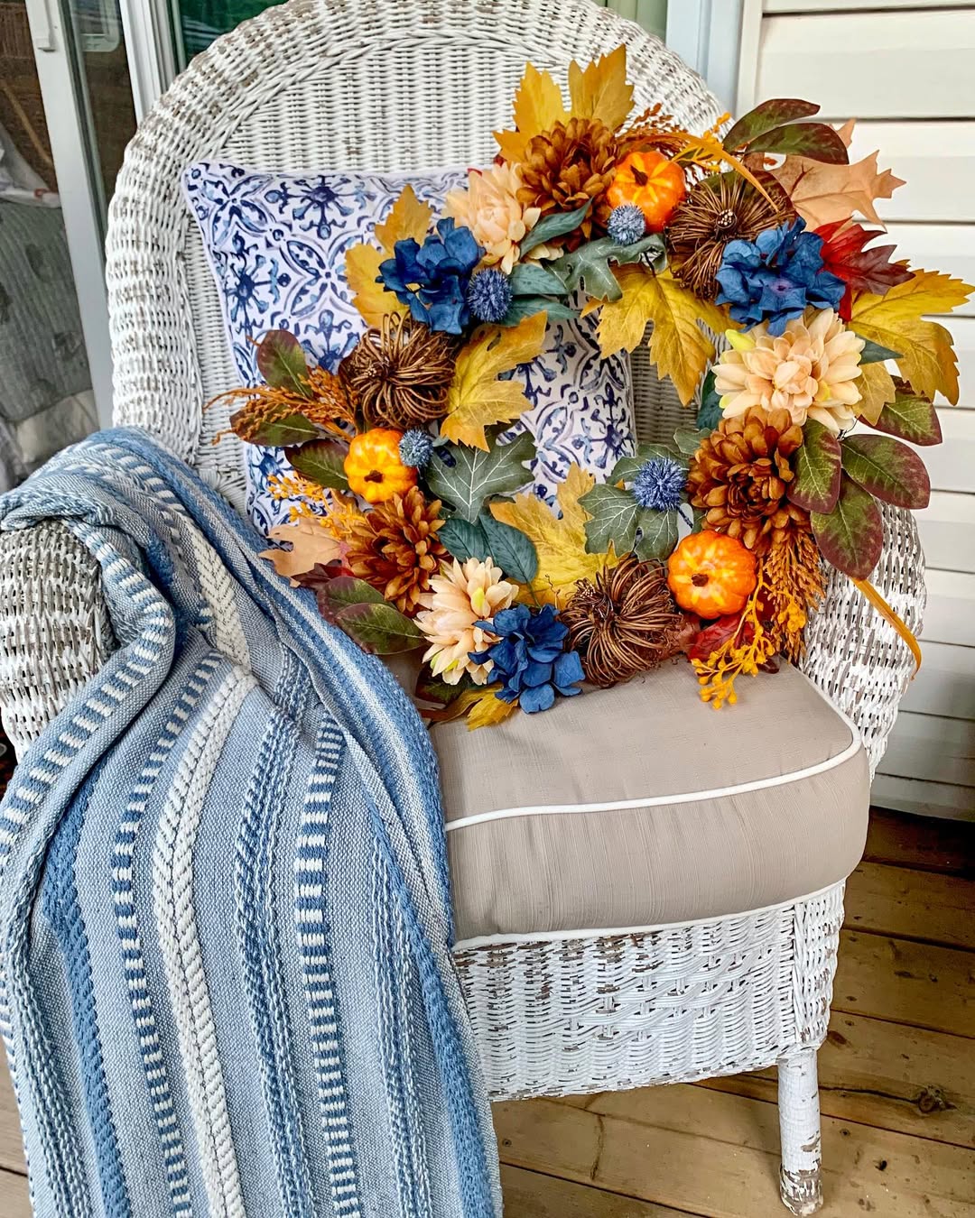 Golden leaves, blue florals, and mini pumpkins all land softly on a textured grapevine wreath, leaning into fall without going full rustic overload. A striped knit throw and patterned pillow quietly echo the palette, making the whole setup feel styled but not stiff. Perfect for a morning coffee or post-dinner unwind on the porch.