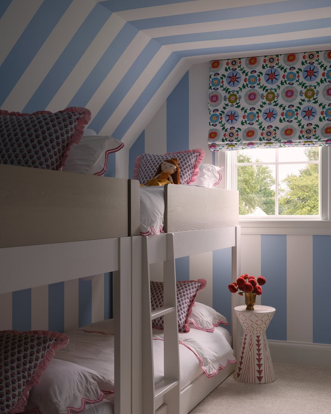 Sky blue and white stripes stretch across the angled ceiling like a circus tent—in the most charming way. Whitewashed bunks keep things calm beneath the pattern party, while pink piping and playful pillows add just enough sass. A bold roman shade brings in more color without competing. No notes—just fun.