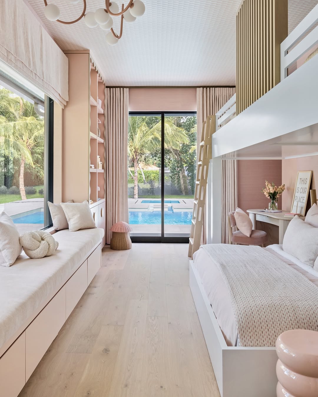 Pale pinks, soft woods, and a wall of windows make this bunk room feel more like a boutique suite. The built-in daybed doubles as a chill zone and storage hero, while the desk nook brings major “study with a view” energy. Layered textures—from boucle pillows to a scalloped stool—keep the monochrome palette interesting. Bonus points for a ladder that looks sculptural, not just functional.