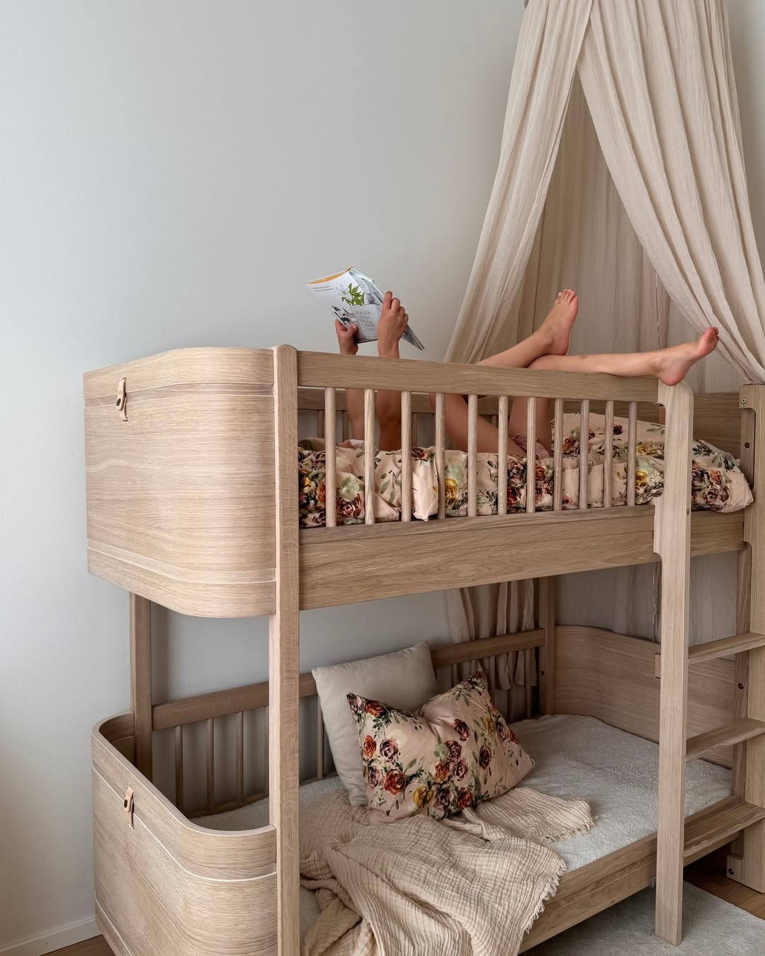 Pared-back oak bunks and rounded edges give this setup a gentle, sculptural feel—nothing bulky, nothing loud. Muted floral bedding adds just enough pattern without stealing the calm. The canopy up top brings a storybook vibe, perfect for quiet reading or mid-afternoon daydreams. Every detail whispers, not shouts.