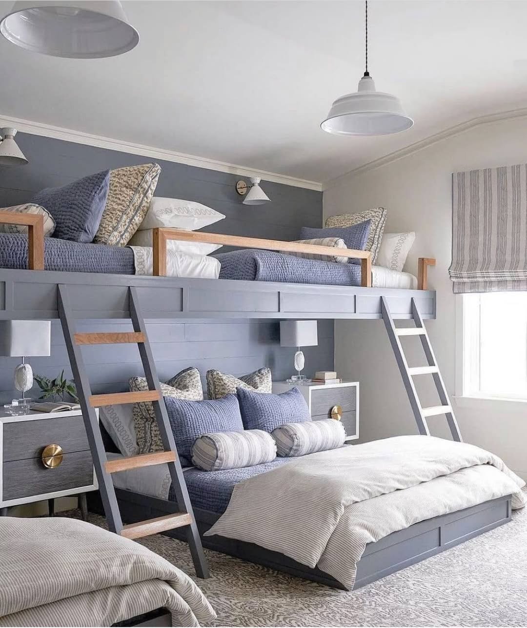 Moody blues and layered neutrals give this quad bunk setup a tailored, grown-up feel—perfect for hosting cousins or friends in style. Dual ladders make the top bunks easy to access, while sconce lighting and full-size lower beds mean no one’s drawing the short straw. Even the drawer pulls feel elevated. Proof that a packed house can still look polished.